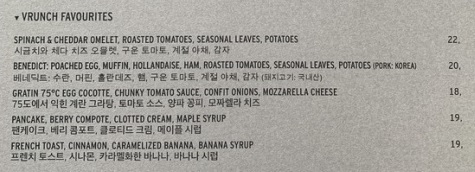 메뉴들은 정통 브런치 메뉴로 에그베네틱트, 오믈렛, 팬케이크, 프렌치 토스트 4개 메뉴로 단출하다. 여자들끼리의 모임이나 가족모임 장소로 조용하게 여유로운 분위기에서 즐길 수 있는 곳이다. 맛도 분위기도 모두 만족스러운 곳이다.