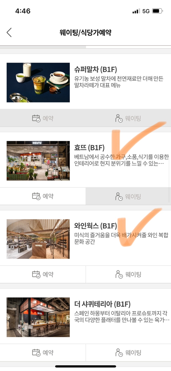 서비스 바로가기 > 웨이팅 식당가예약을 선택하면