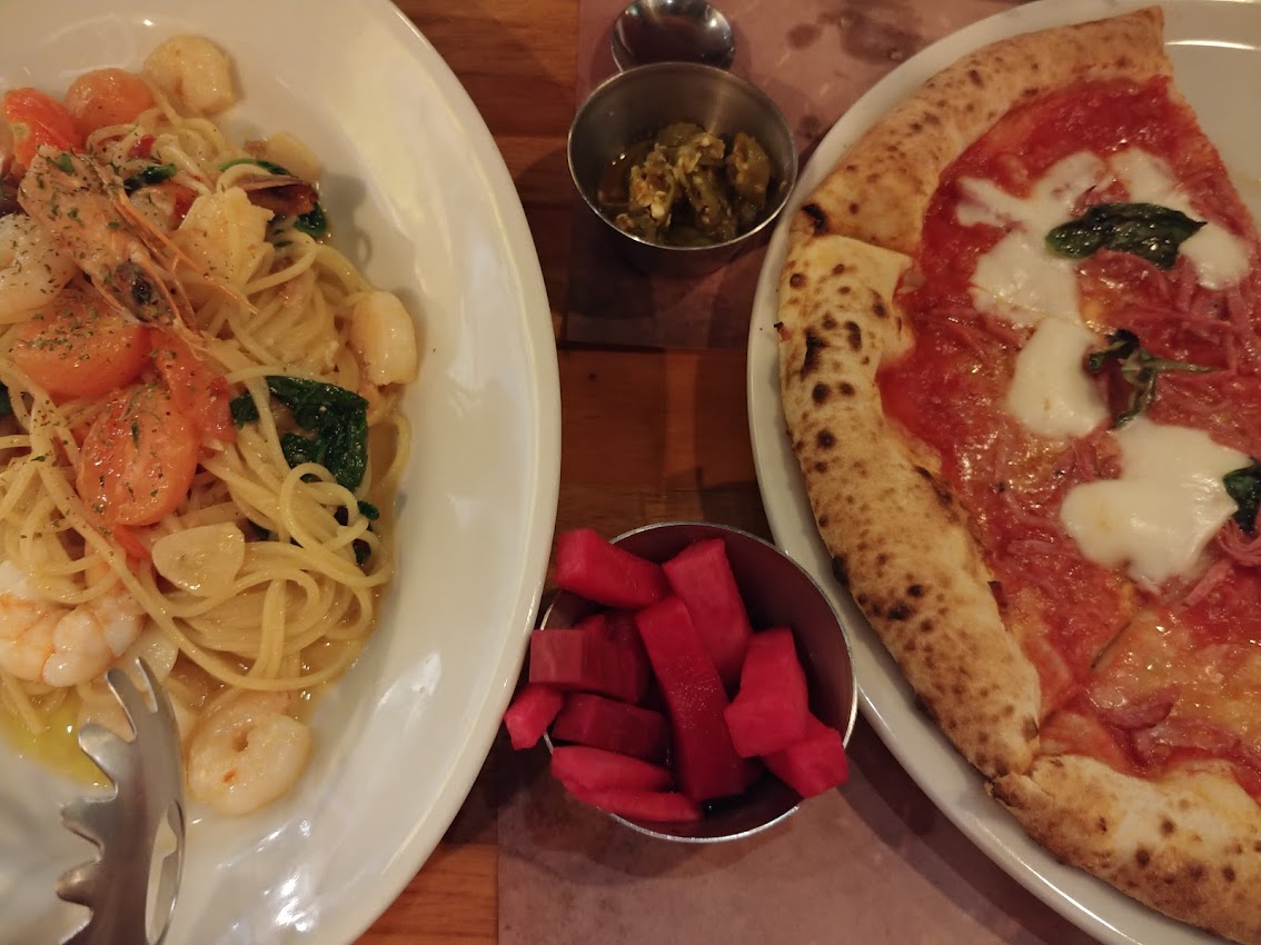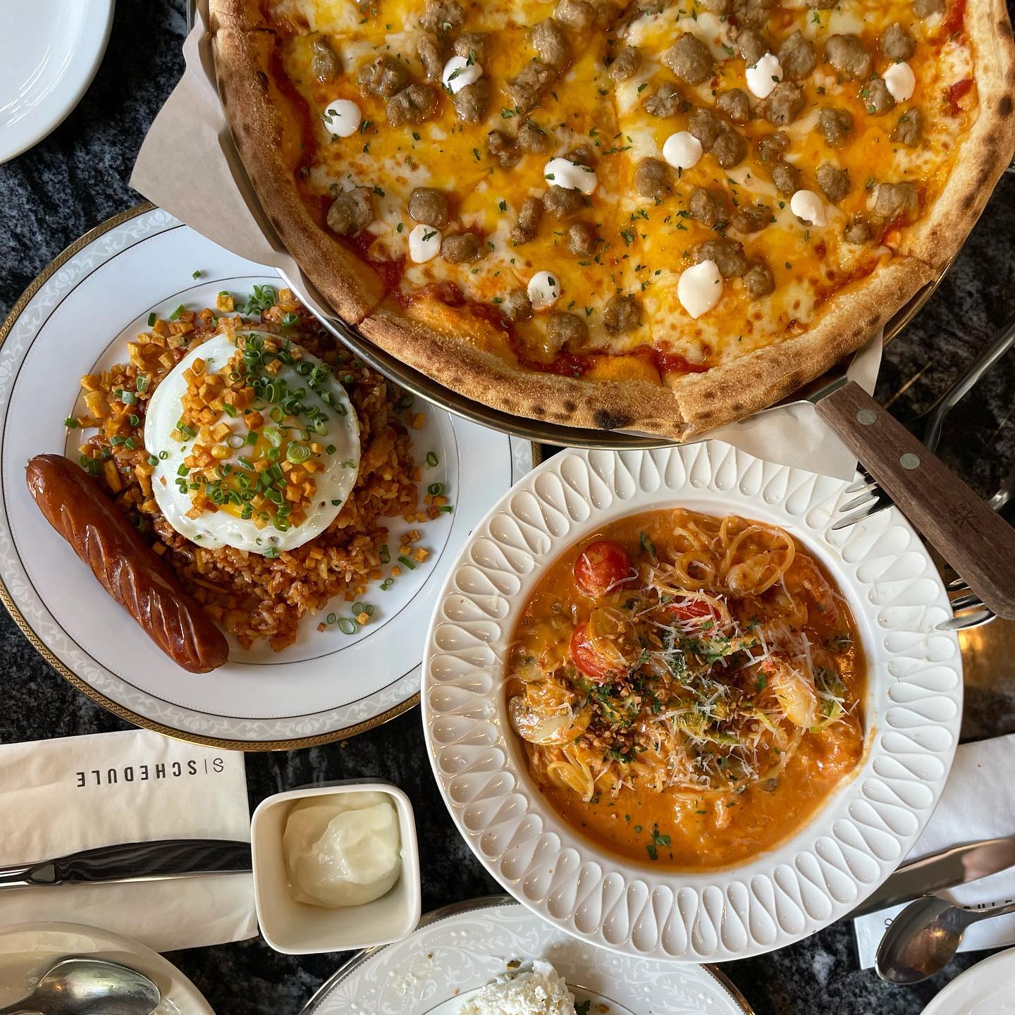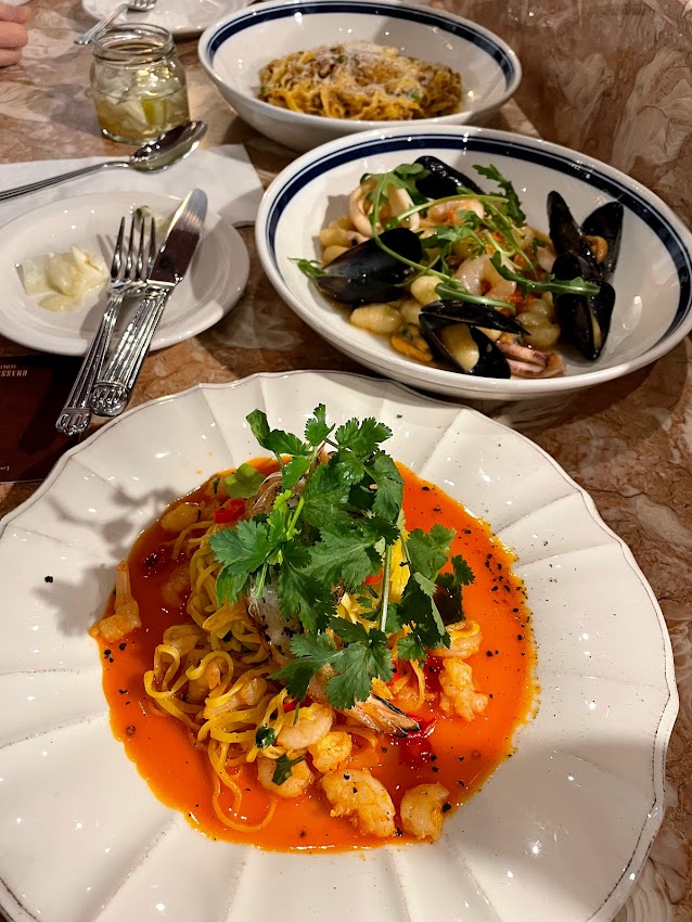 생면파스타로 만든 라구파스타와 새우볶음면, 북유럽식연어회, 지중해풍 오징어튀김, 사워도우도 훌륭해 👍🏻