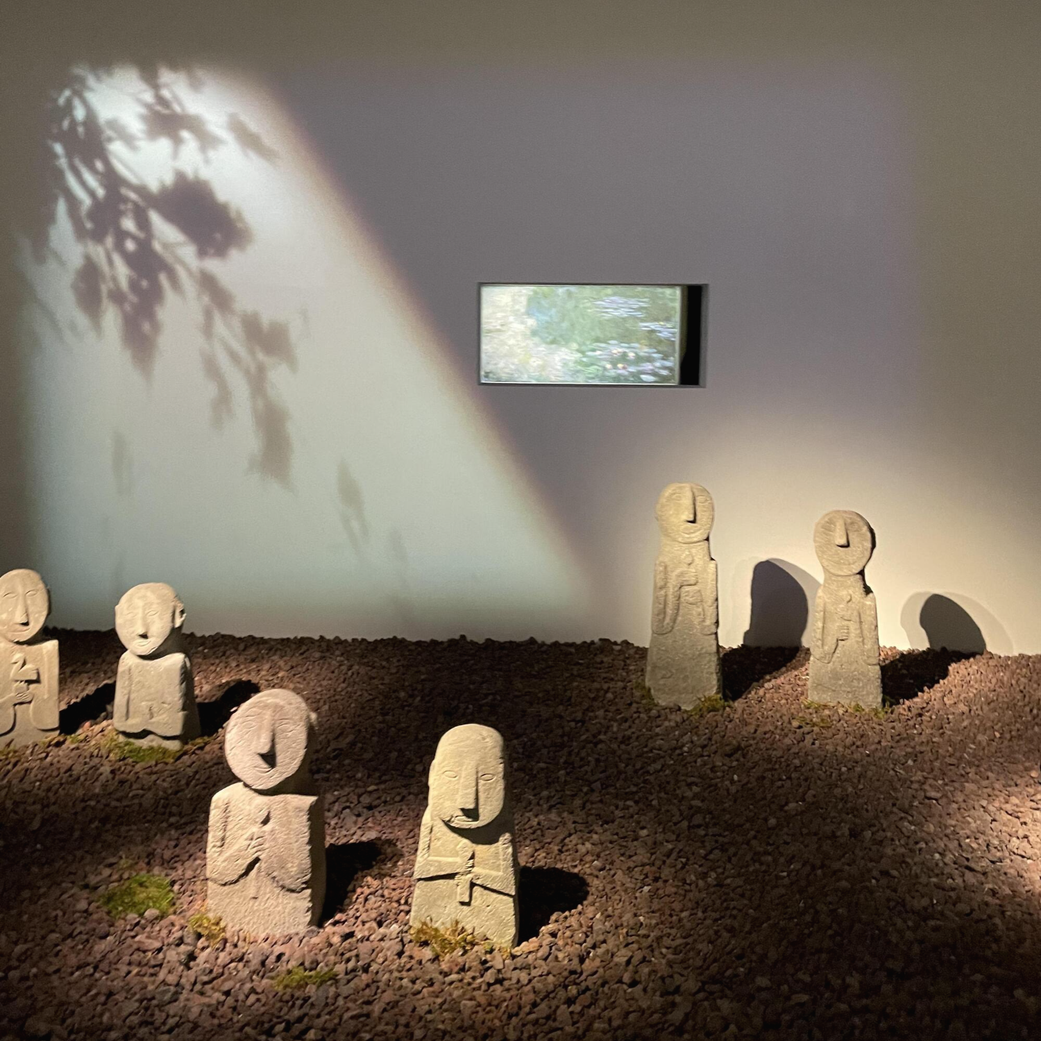 햇살이 내리쬐는 웃음 띤 동자석 뒤로 빼꼼히 난 작은 창에 비치는 꽃 그림자와 그 뒤로 수련이 흐드러지게 핀 연못이 무척 아름다웠다.