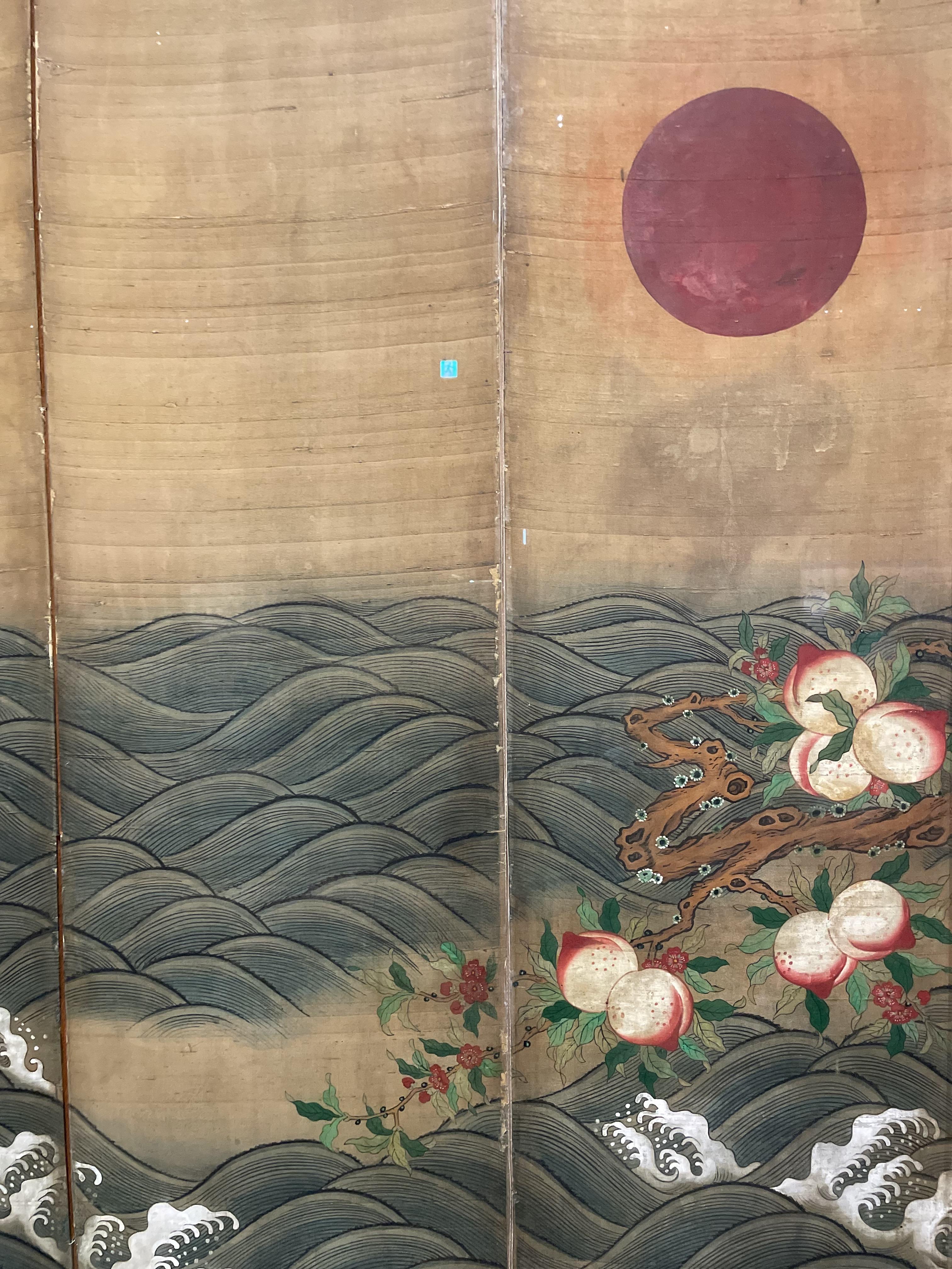 십장생도에는 기암괴석 사이로 물이 흐르고, 영지버섯이 피어난다. 약 10미터에 달하는 병풍에는 거북, 학, 천도복숭아, 해와 달, 소나무 등 장생을 상징하는 소재가 파노라마처럼 펼쳐진다. 총 16짝에 달하는 대폭 회화의 중간 중간 창호지를 바른 창이 달렸다. 4개 면을 세우면 방안에 또 새로운 공간을 만들 수 있어 왕실에서 공간을 구획할때 사용한 것으로 보인다.