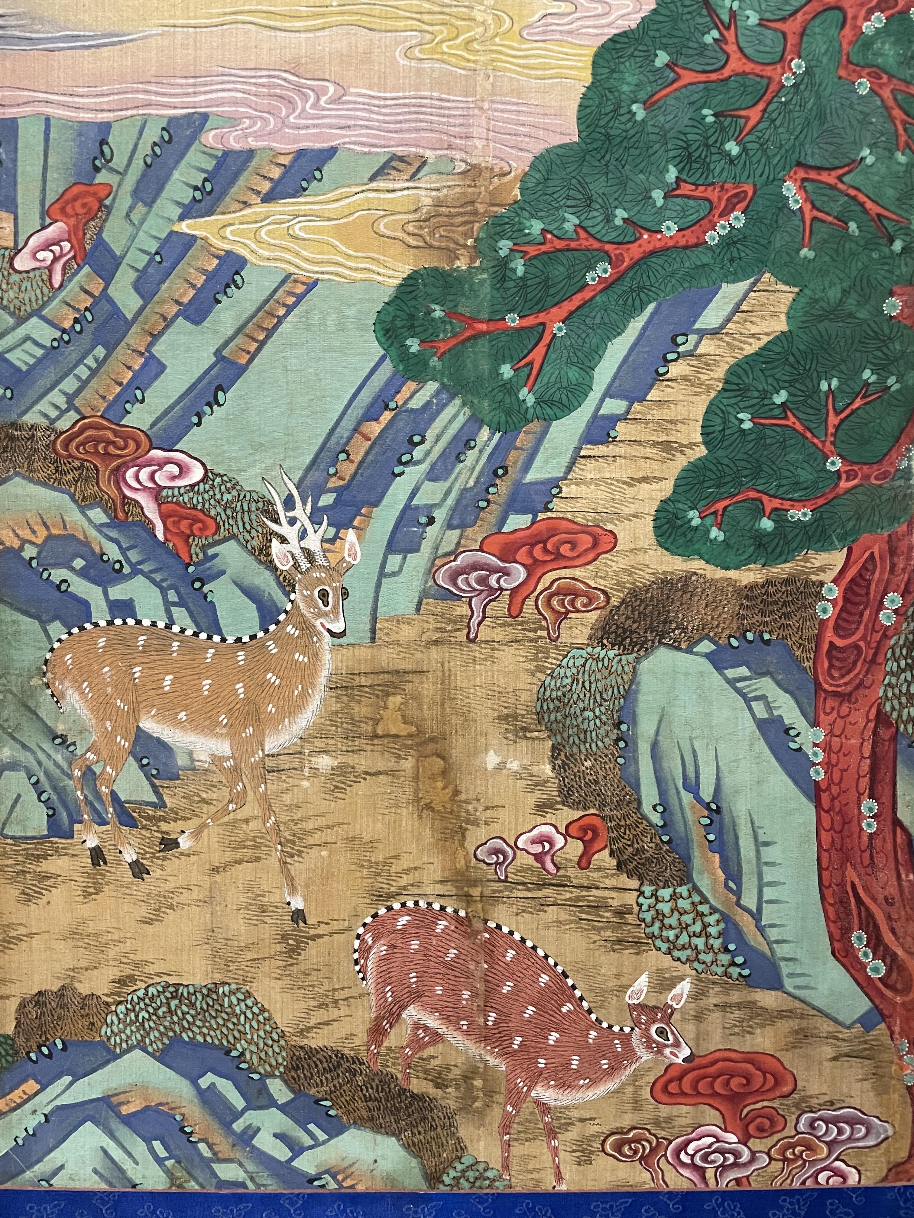 십장생 중 장수를 상징하는 소나무를 중앙에 두고 주위에 학과 사슴이 주변에 그려져 있는 근대적 화법의 장생도