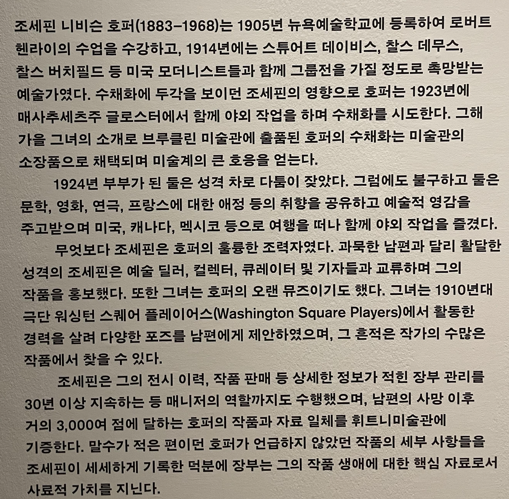 아내 조세핀은 예술 업계 사람들과 교류하며 사후에는 2,500여 점에 달하는 호퍼의 작품과 자료 일체를 휘트니미술관에 기증해 지금의 호퍼의 명성을 드높인 공로가 높다. 역시 남편이 성공하려면 아내의 조력이 중요하다는 교훈 ^^
