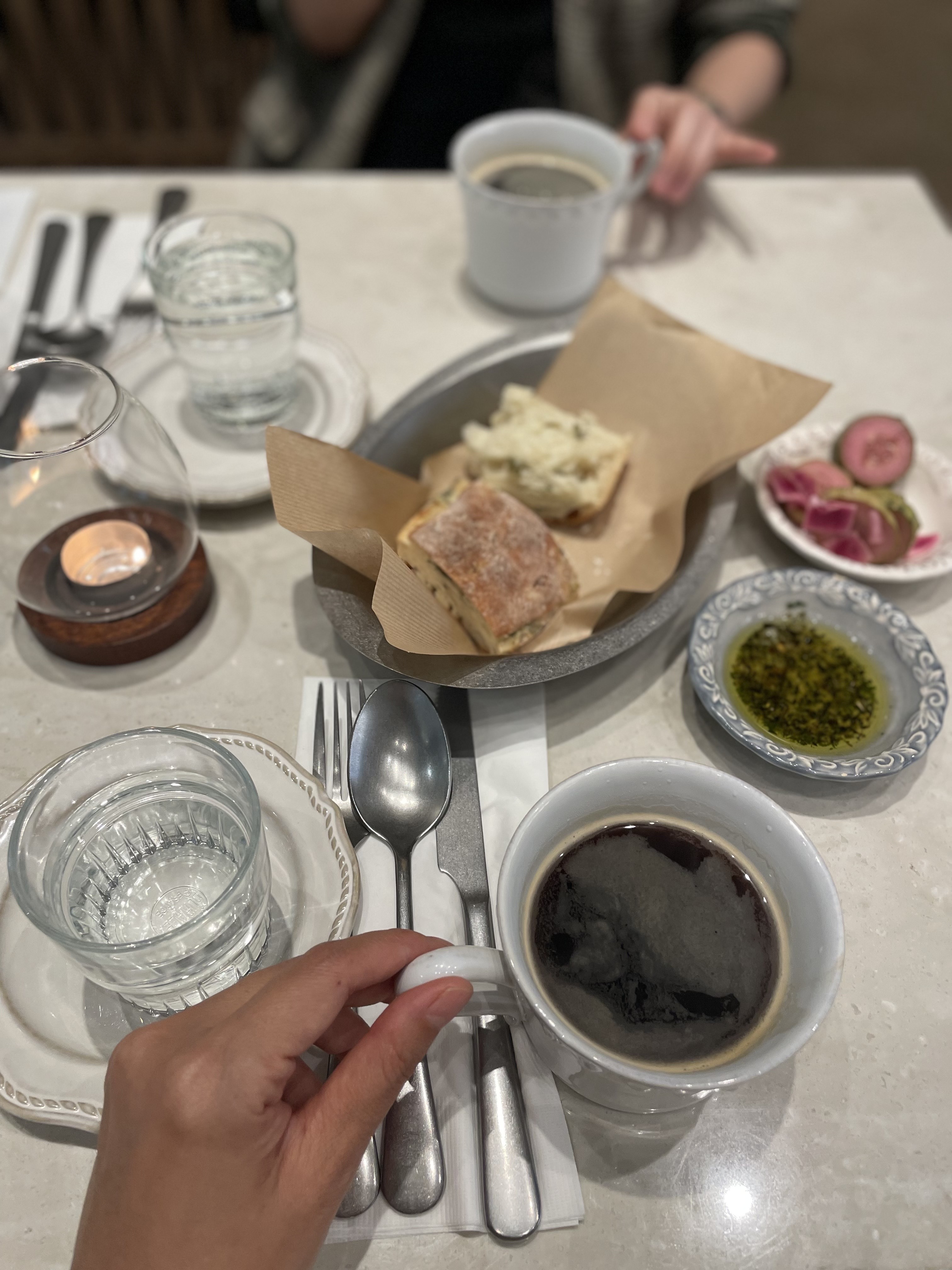 따듯하게 데워져 나오는 빵은 바질과 올리브 오일에 찍먹하면 맛나고 저녁 시간에 따라 조명이 톤 다운되는 세심한 서비스가 매우 맘에 들었다. 커피도 음식과 잘 어울리게 진하지 않아서 좋았다.