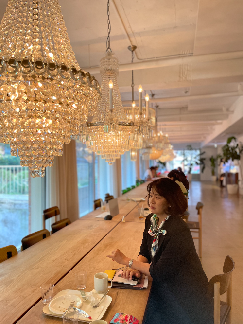 긴 테이블 위 블링블링한 샹들리에 아래에서 맛있는 커피 한잔이면 힐링 끝이다.