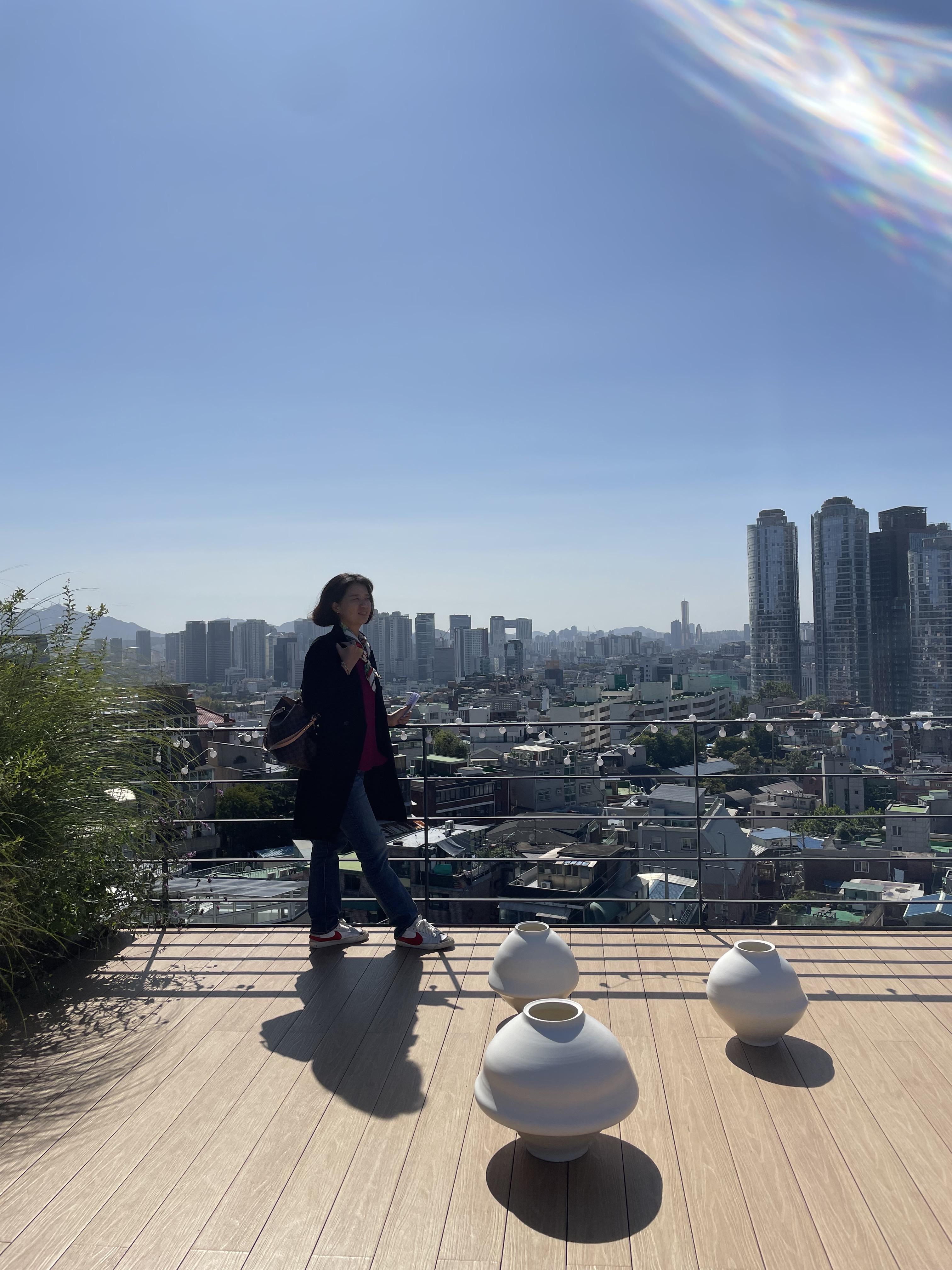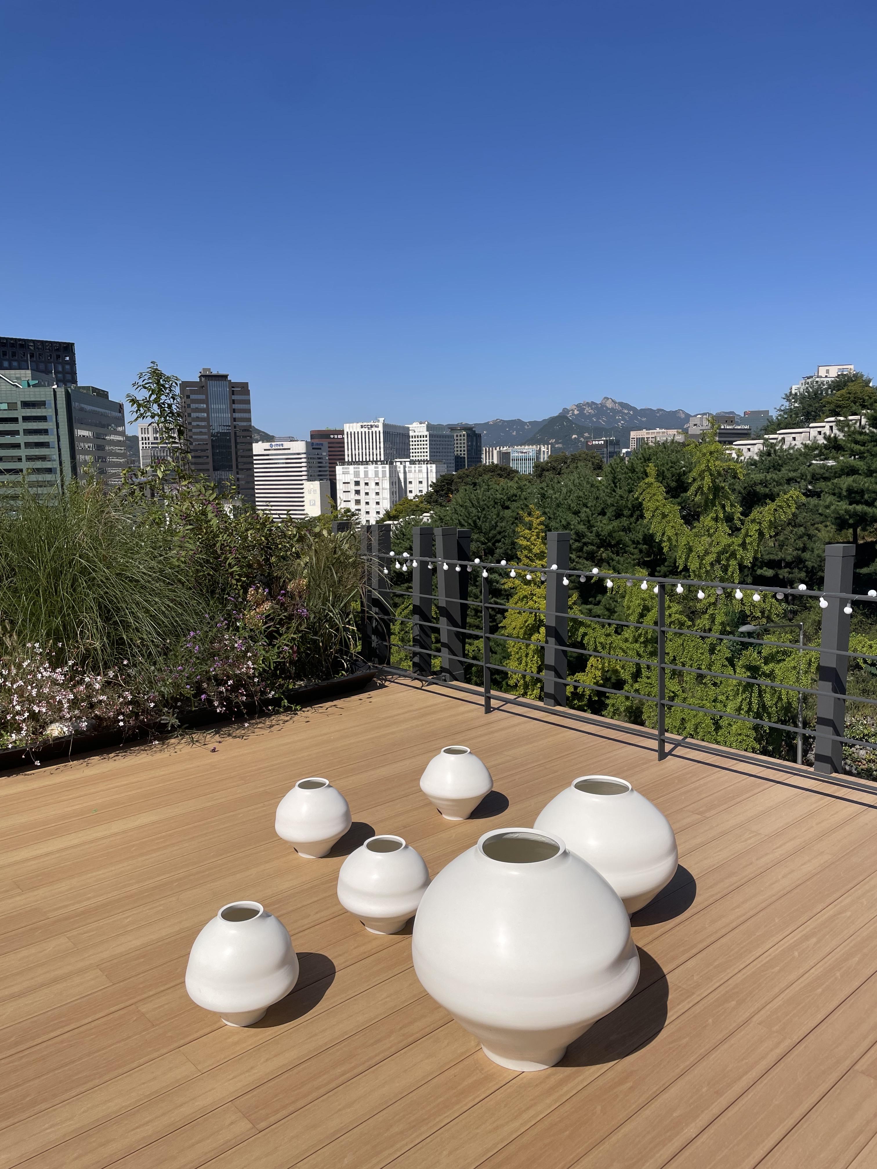 옥상 정원으로 향하는 계단과 서울 시내를 조망하는 야외 루프탑 공간에는 한국 도예작가 무진 신원동의 달항아리 작품을 볼 수 있다. 한국의 전통적인 도자기 기법과 현대적인 미적 감각을 결합해 정원 배경과 매끄럽게 조화를 이룰 유기적인 실루엣과 차분한 색상의 달항아리의 조화가 아주 멋들어진 공간이었다.