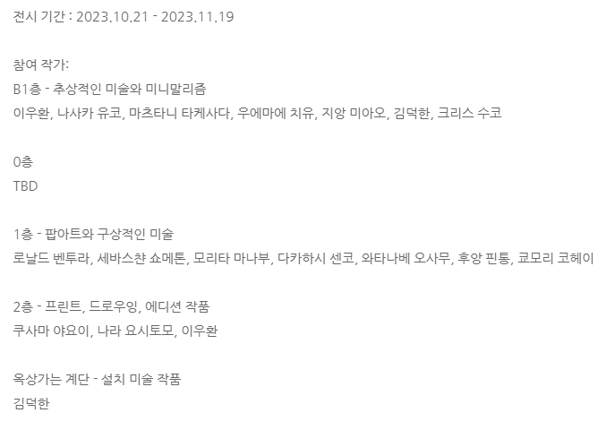 우리가 간 날은 바로 전날 전시를 철수해서 보지 못했고 철수할 때는 공사 소음도 많으니 전시 일정 확인 후 방문하면 좋겠다.