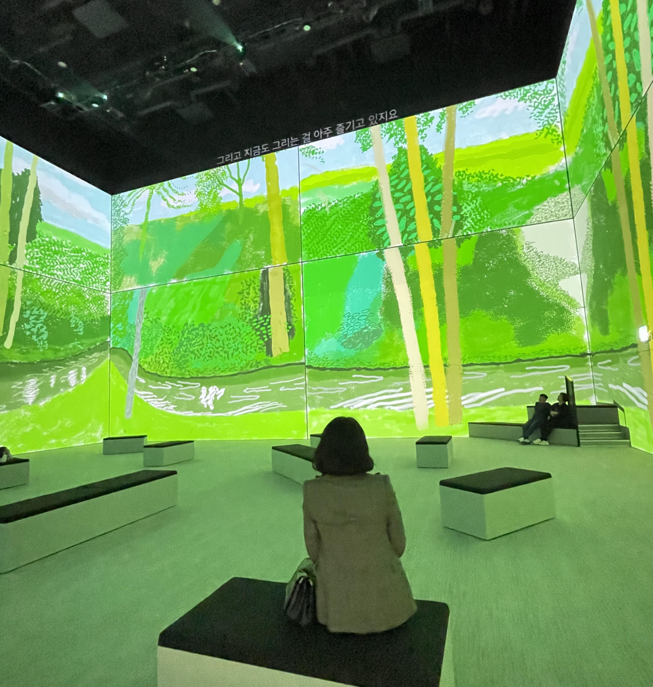 5개 면에 펼치는 몰입형 미디어아트는 퍼스펙티브에 대한 새로운 실험 놀이터로 삼는듯하다. 이 전시는 15미터 높이 거대한 큐브의 5개 면(4벽과 바닥)에서 상영되는 단일 작품으로 2D로만 보던 호크니의 작품이 살아 숨쉬며 움직이는 것만으로도 장관이다.