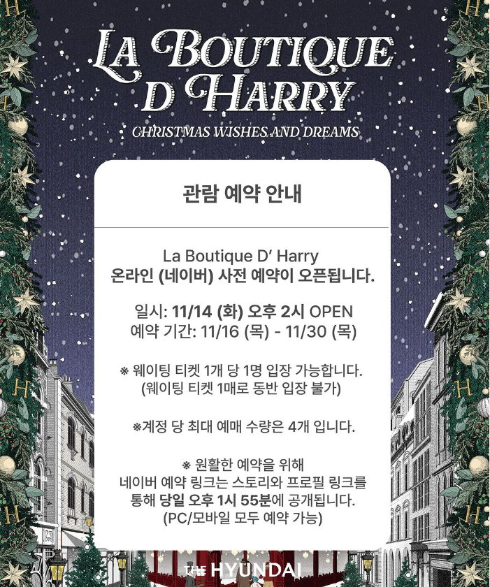 - LA BOUTIQUE D’ HARRY 입장은 네이버 사전 예약과 현장 웨이팅을 통해 관람 가능합니다.