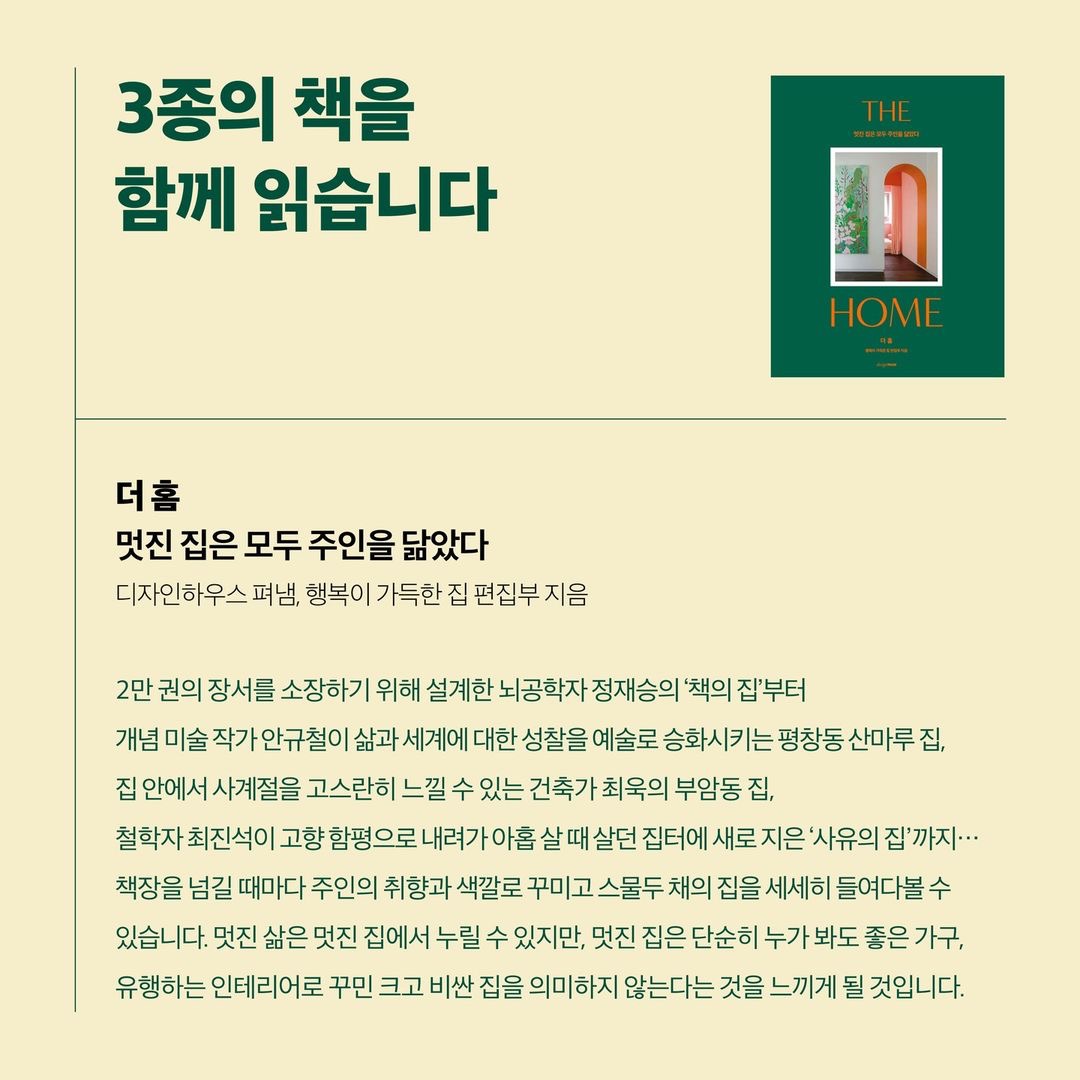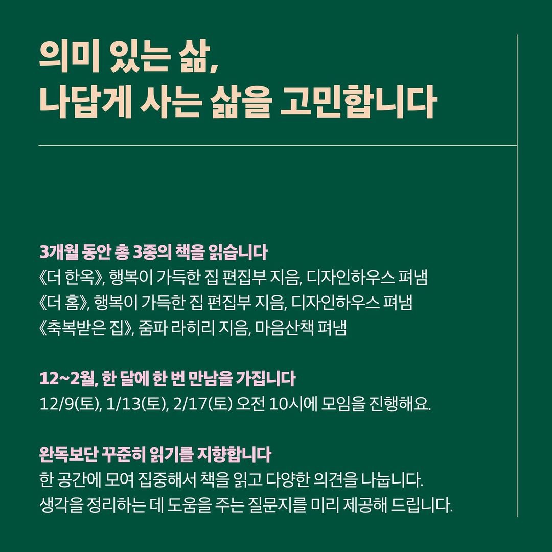 그래서 한 해의 끝자락에 시작하는 이번 북클럽 모임에서는 '내가 가장 나다워지는 공간'이자, '가장 행복해야 하는 공간'인 집에 대해서 이야기를 나누는 시간을 가져 보려고 합니다. 내가 꿈꾸는 집과 인생에 대해서 찬찬히 생각해 보고 싶은 분이라면 누구나 환영합니다. 프로필 링크를 통해 신청 가능합니다.⠀