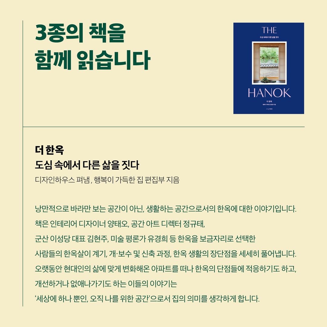 이번 4기의 선정도서는 디자인하우스에서 펴낸 더한옥(12월), 더홈(1월), 축복받은 집(2월) 총 3권이다.