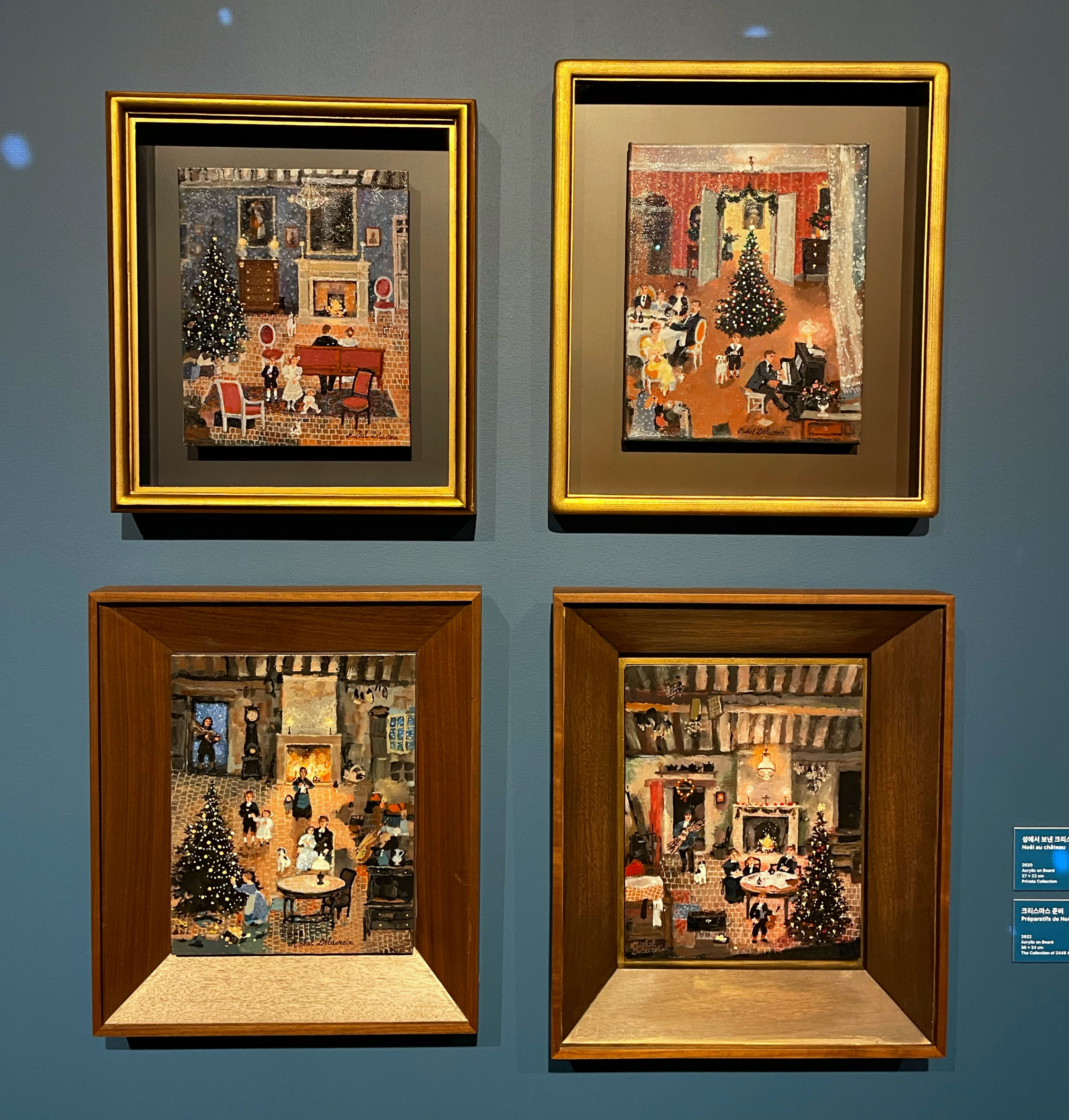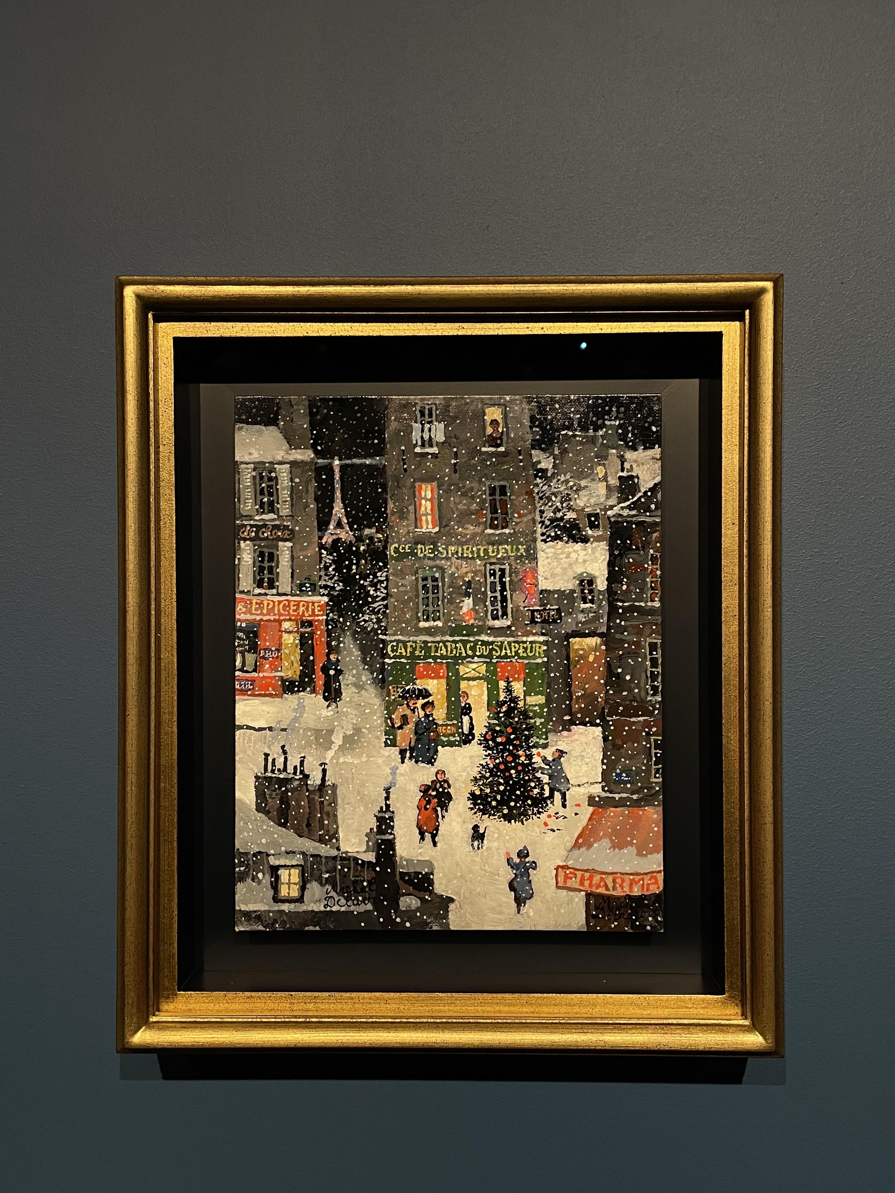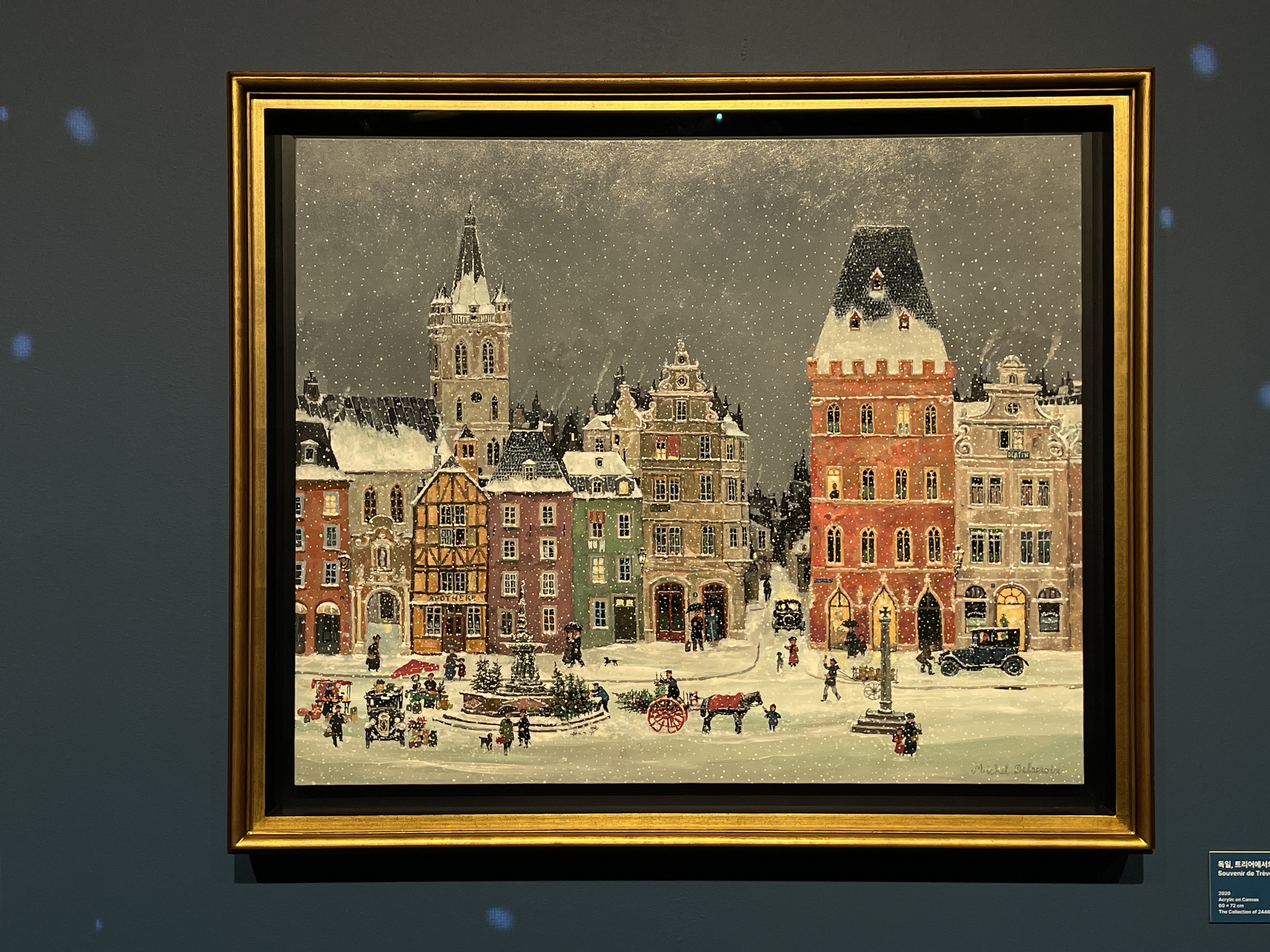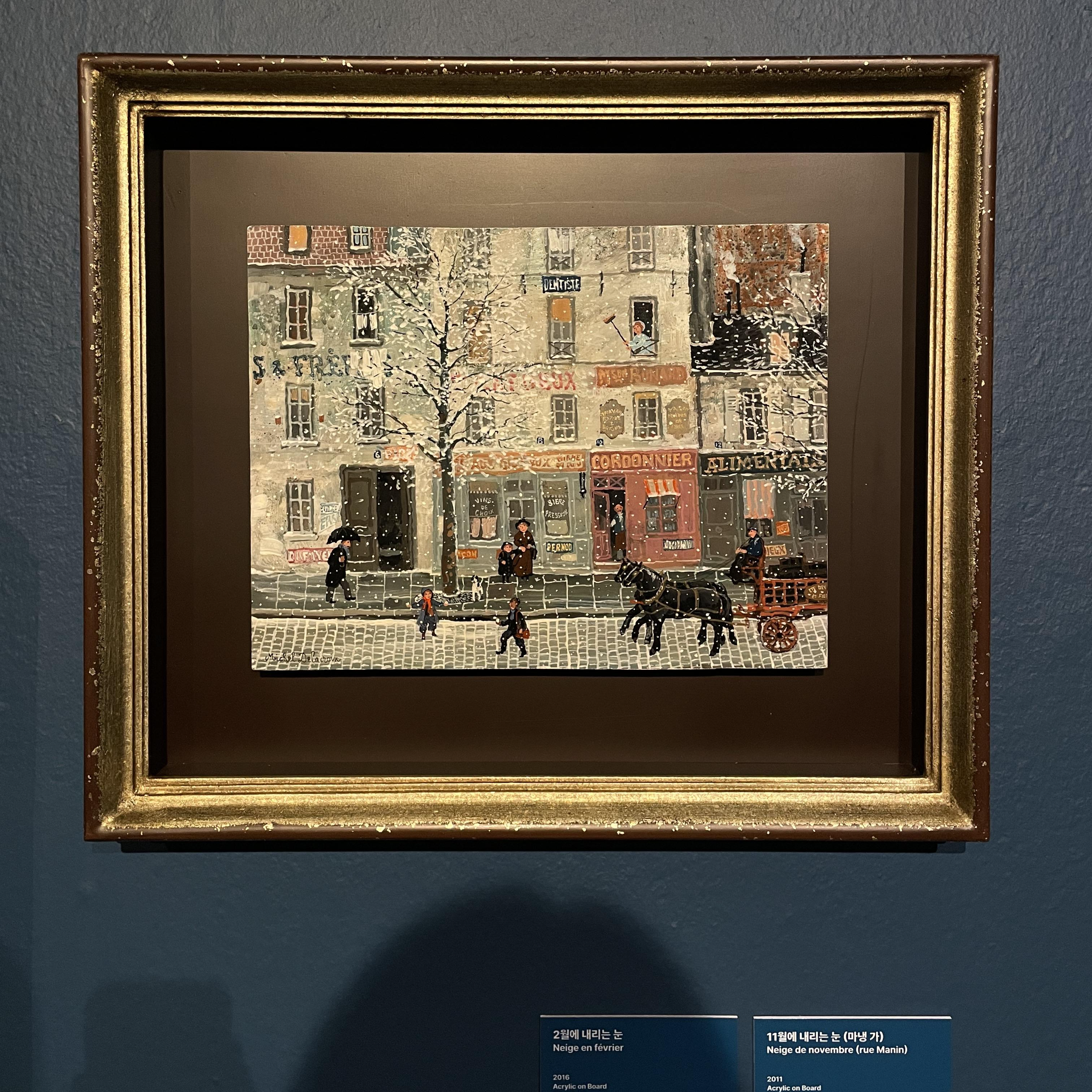 주제는 그가 사랑한 도시 ‘파리’와 ‘벨 에포크’(1890년대 벨 에포크 고유명사가 아닌, 프랑스어 원어 그대로 ‘아름다운 시절’을 의미)다. 유년시절 1930~40년대 자신의 기억 속 파리의 낭만적인 풍경을 아이가 그린 것 같은 '나이브 아트' 기법으로 순수하고 포근하고 따뜻한 크리스마스 분위기를 느낄 수 있어 좋았다. 지금은 없는 굴뚝과 기차의 연기들과 마차들, 가스등, 빨래를 너는 풍경 등이 정겨운 추억을 되새겨준다. 역시 어린 시절의 행복한 기억은 평생의 자산이 되는가보다.