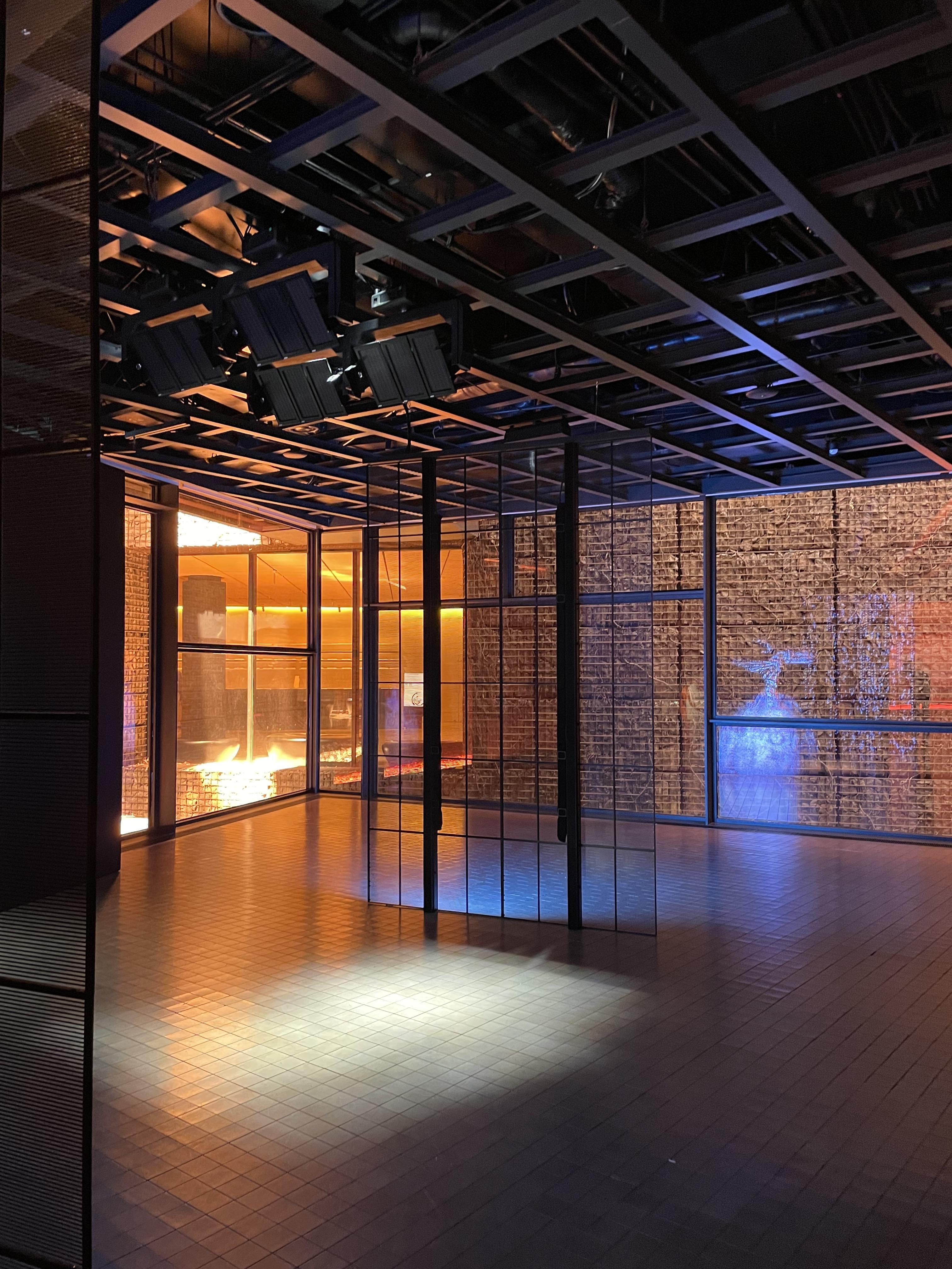 미술관 안은 조명이 깜박이며 벽이 움직이고 시계 태엽이 작동한다. 눈이 녹는 소리가 들리며 거대한 스피커가 움직이고 광원이 이리저리 돌아다닌다.