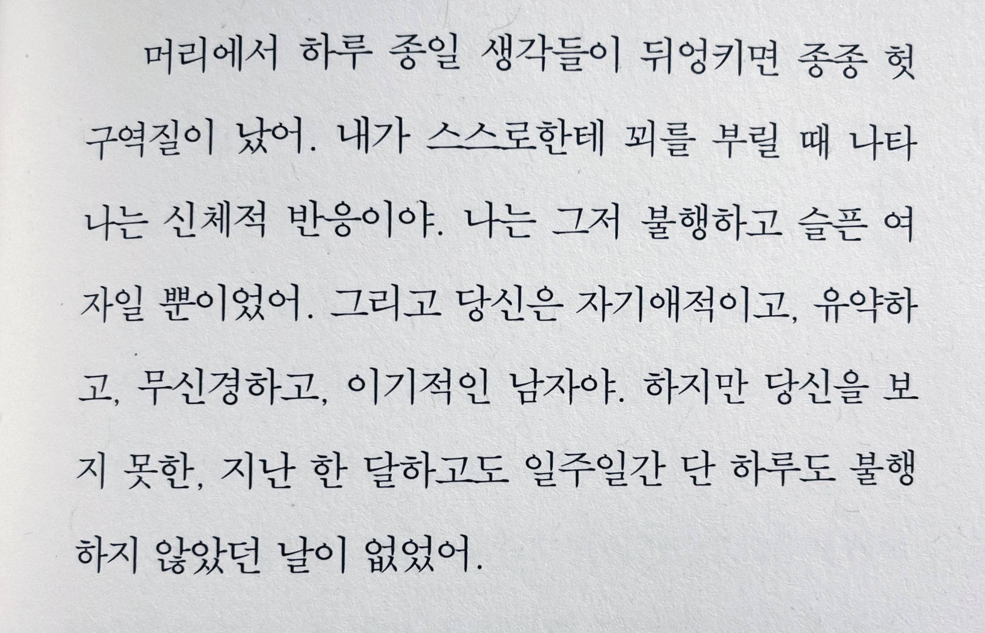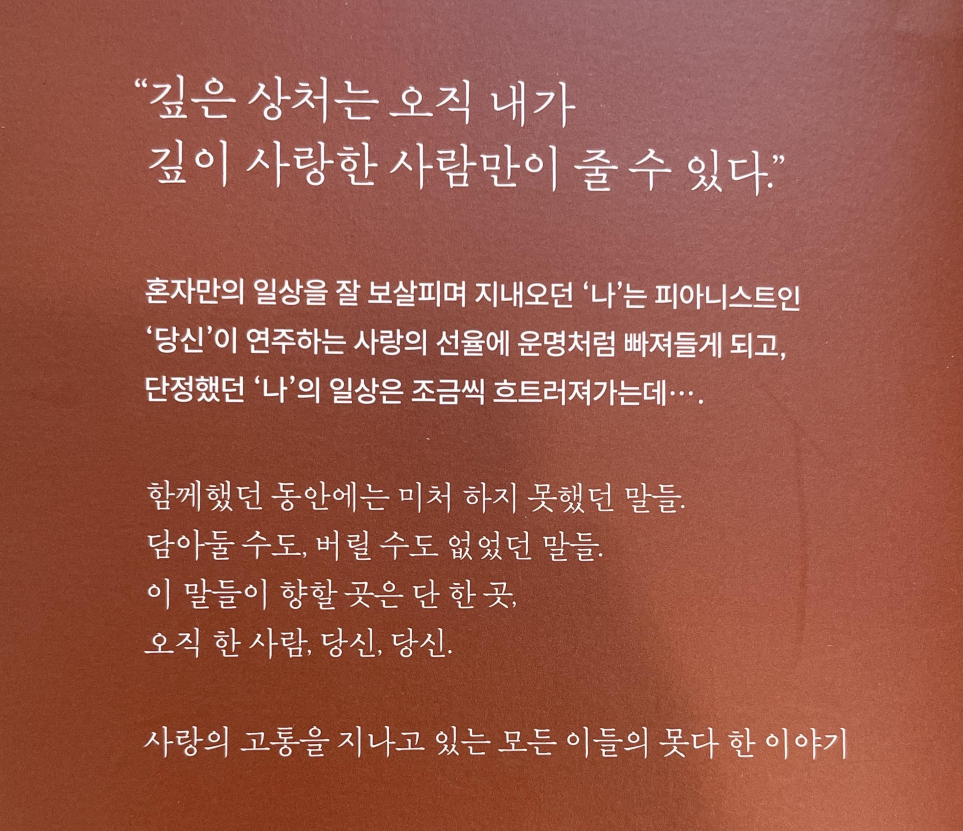 임경선 작가의 <다하지 못한 말>. 광화문의 공무원 여성과 피아니스트 남성의 짧은 사랑 이야기이다. 사랑에는 피해자도 가해자도 없다고 했지만 조금 덜 사람한 사람이 더 사랑한 사람에 비해 권력(우위)을 갖는 건 사실이다.
