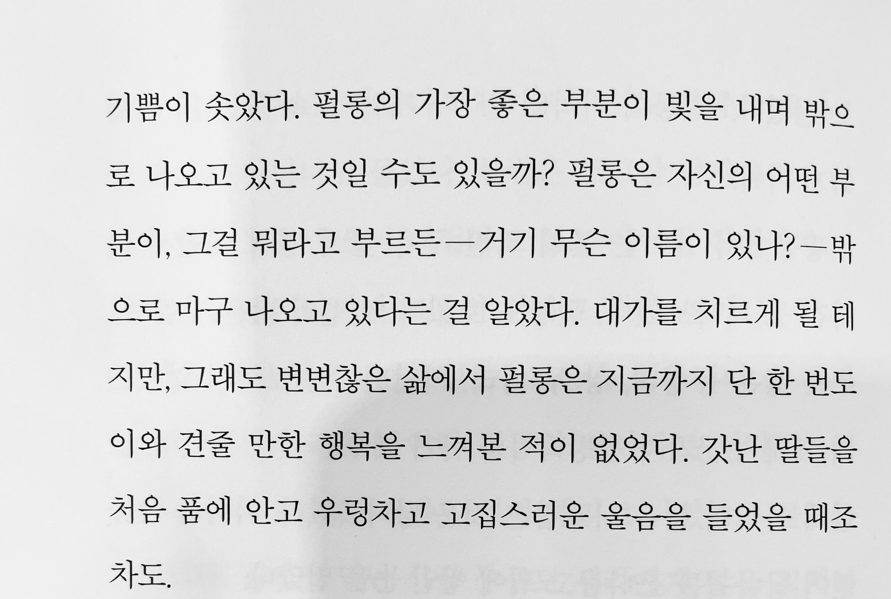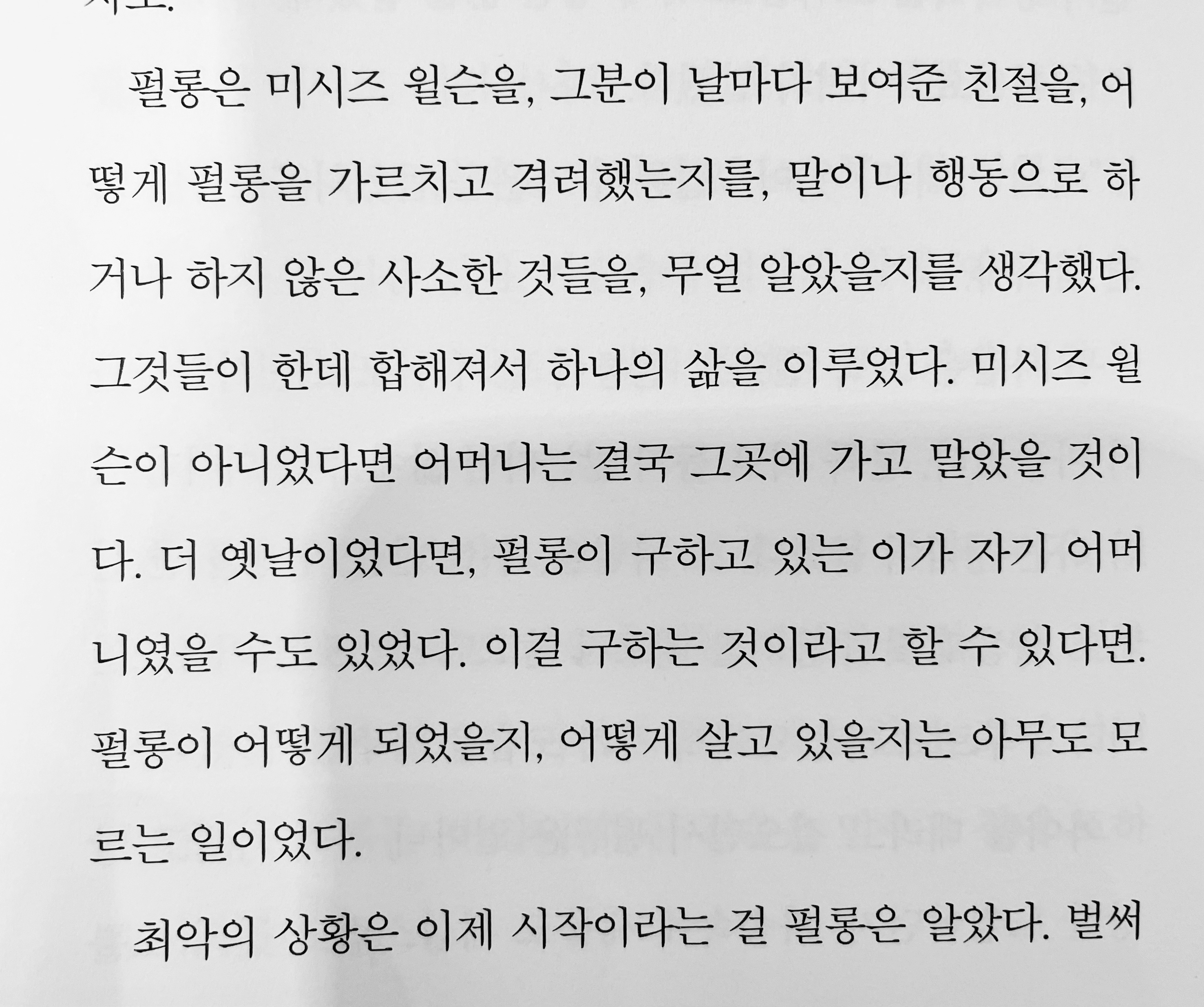 펄롱은 미시즈 윌순을, 그분이 날마다 보여준 친절을, 어떻게 펄롱을 가르치고 격려했는지를, 말이나 행동으로 하거나 하지 않은 사소한 것들을, 무얼 알았을지를 생각했다. 그것들이 한데 합해져서 하나의 삶을 이루었다. p.120