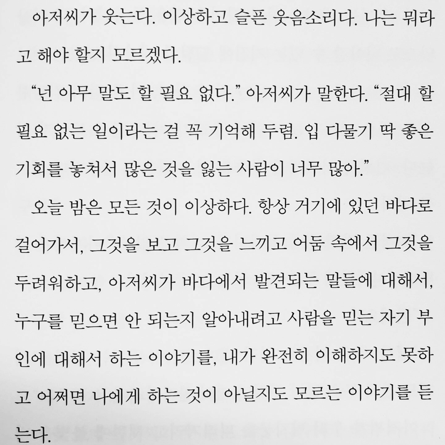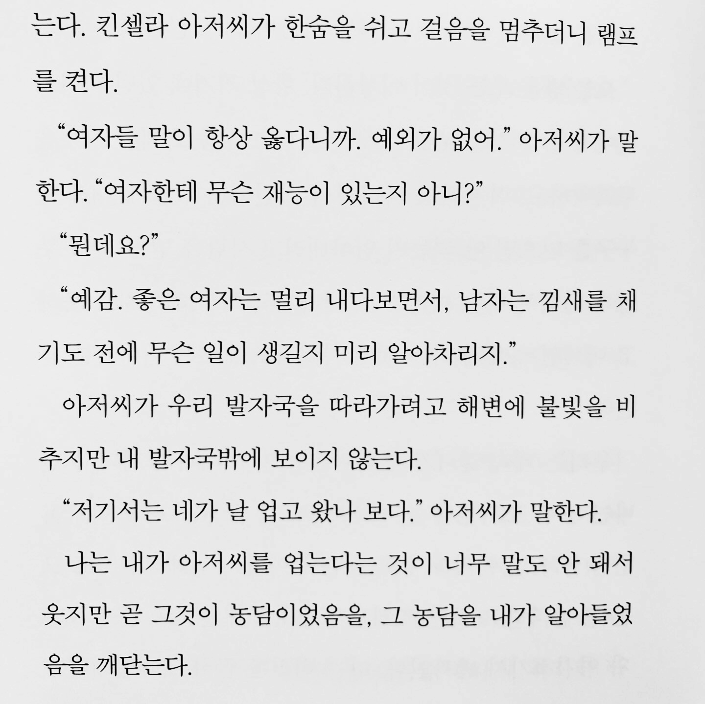 이 짧은 소설은 차라리 시였고, 언어의 구조는 눈 결정처럼 섬세했다.명시적으로 말하게 않고 미묘하게 암시한다. 두 번 읽어야 알 수 있는 것들, 아니 세번, 네 번 읽었을 때야 눈에 들어온 것들도 있었다.