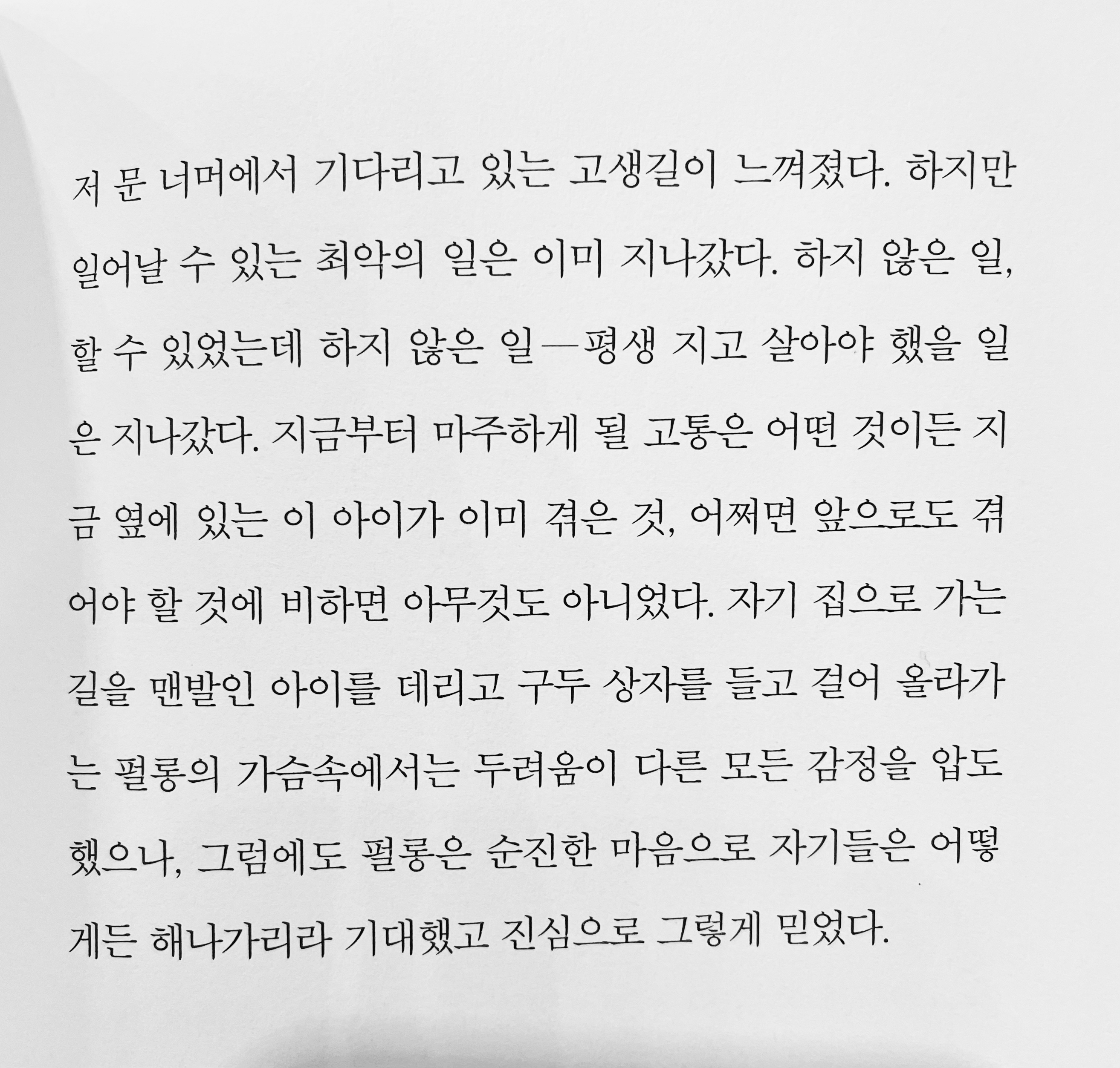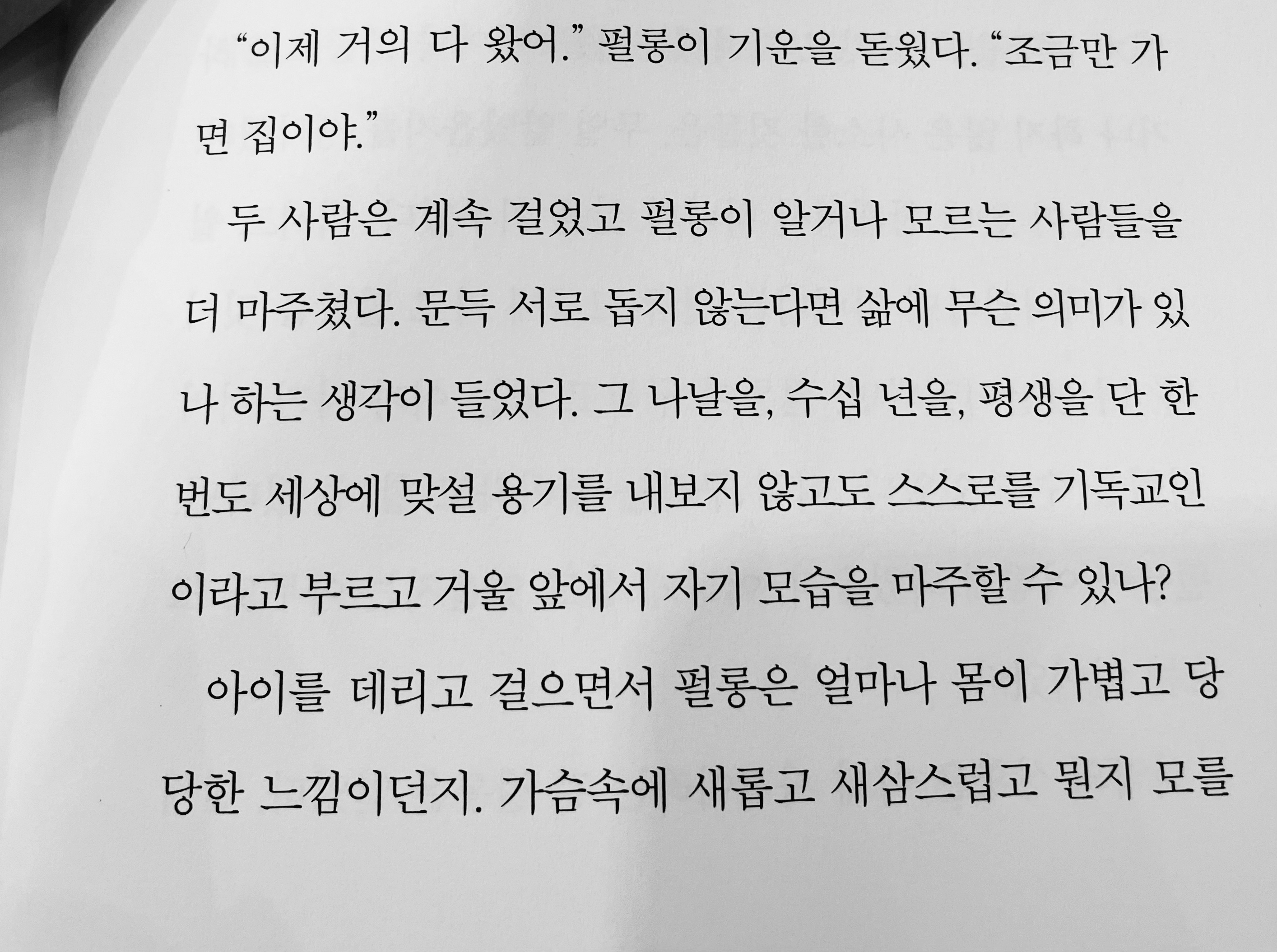 문득 서로 돕지 않는다면 삶에 무슨 의미가 있나 하는 생각이 들었다. 그 나날을, 수십 년을, 평생을 단 한 번도 세상에 맞설 용기를 내보지 않고도 스스로를 기독교인이라고 부르고 거울 앞에서 자기 모습을 마주할 수 있나? p.119