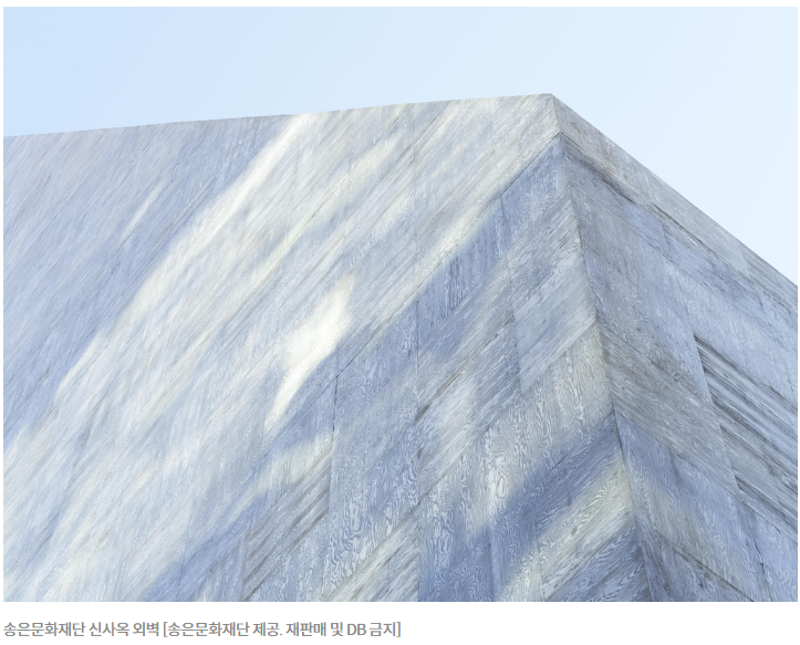 콘크리트 외벽은 목판 거푸집을 사용해 질감을 표현한 ‘숨어있는 소나무’를 뜻하는 ‘송은(松隱)’에서 영감을 받아 콘크리트 표면에 목판의 문양과 결을 새겨넣어 건축물의 부피에 촉감을 더했다고.