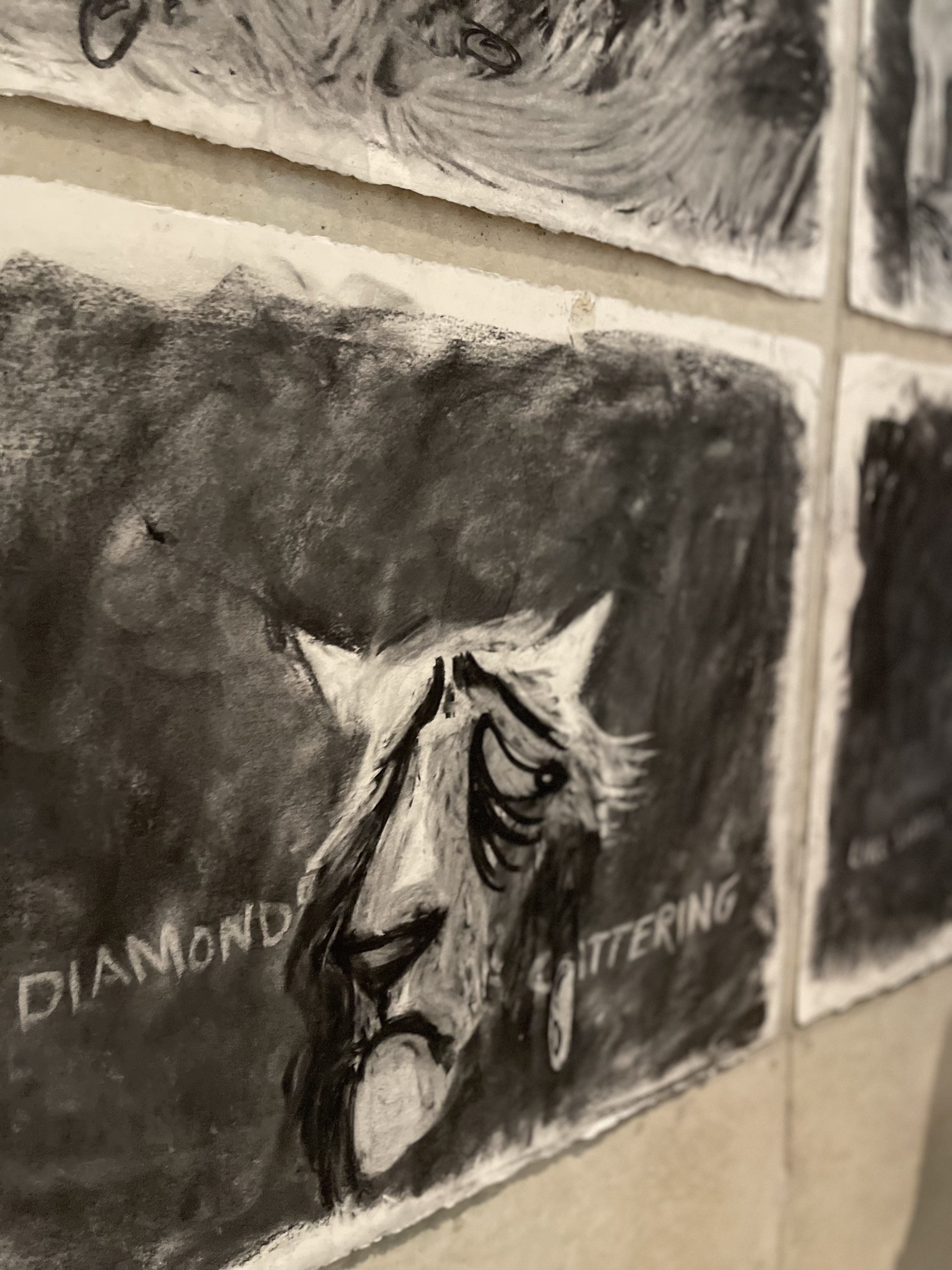 이번 전시 과정을 준비하는 과정에서 그린 목탄화들이 최초로 공개되어 있는 2층 라운지 공간이 나타난다. 전시 중인 목탄 애니메이션 작품 〈Like Beads on a String〉 (2022)의 원화를 비롯해 이번 전시에서는 선보이지 않은 작품 〈Untitled〉 (2023)의 원화, 나탈리 뒤버그와 한스 버그의 이전 전시들의 도록을 볼 수 있어 작가들의 작품 제작 과정을 좀 더 내밀하게 들여다보는 기분이 든다.