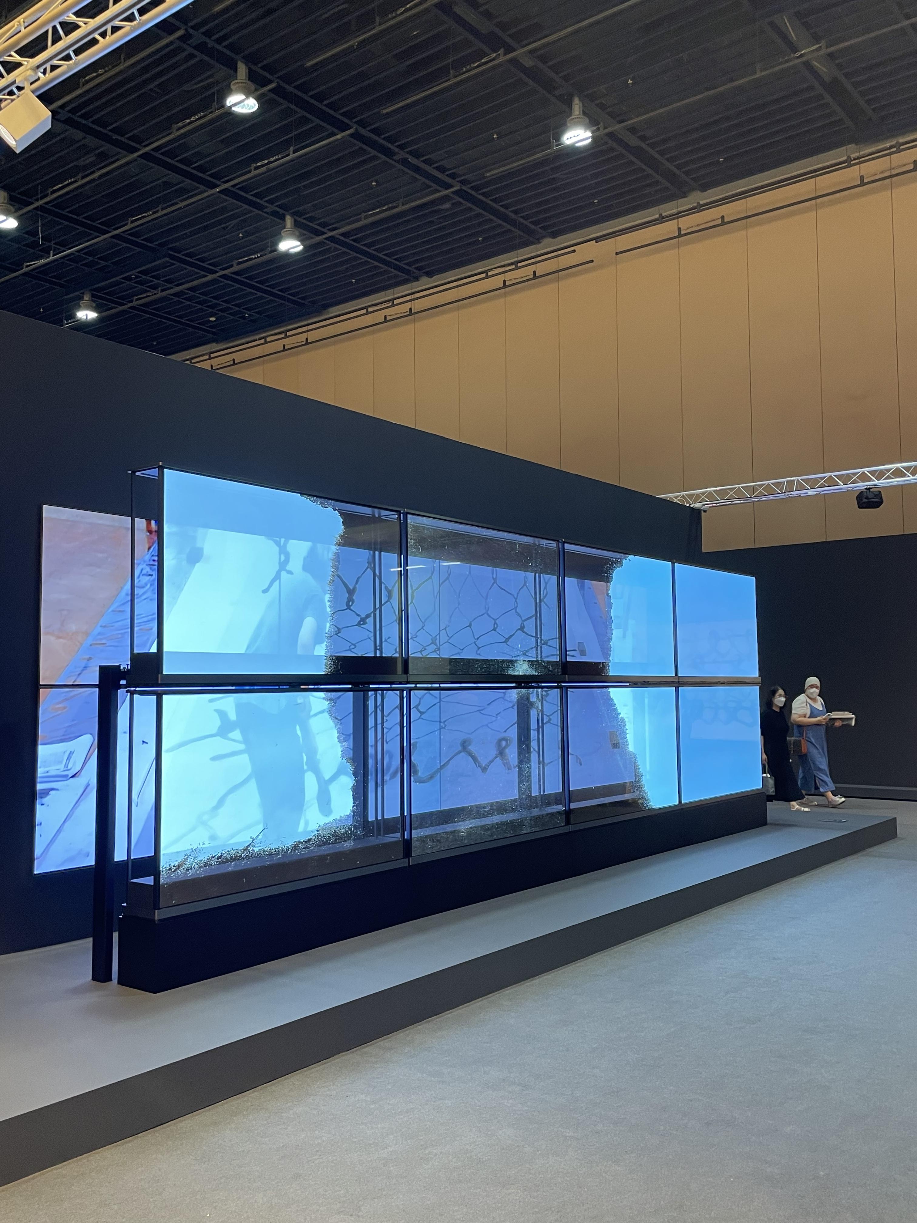 전시장 입구부터 뒤편까지 한눈에 투과해 볼 수 있도록 작품을 겹겹이 배치해 마치 공간 전체를 하나의 작품처럼 구성했다. 전시장을 찾은 관람객은 입구에 위치한 반투명의 설치 작품부터 그 뒤로 나란히 놓인 각각 8대의 투명 올레드 TV와 8대의 올레드 에보(evo)로 구성한 미디어아트 작품을 한 번에 볼 수 있다.