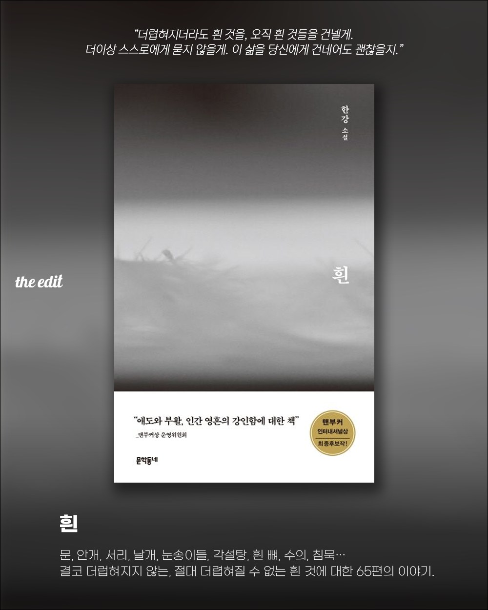그녀의 소설은 가부장제, 폭력, 슬픔, 인간애라는 주제라 읽을 때마다 언제나 힘들었던 기억이 난다. ‘채식주의자’로 2016년 한국인 최초로 맨부커상 수상했을 때 읽었는데 엄청 고통스러웠다. 당시 수상에 대한 평가!