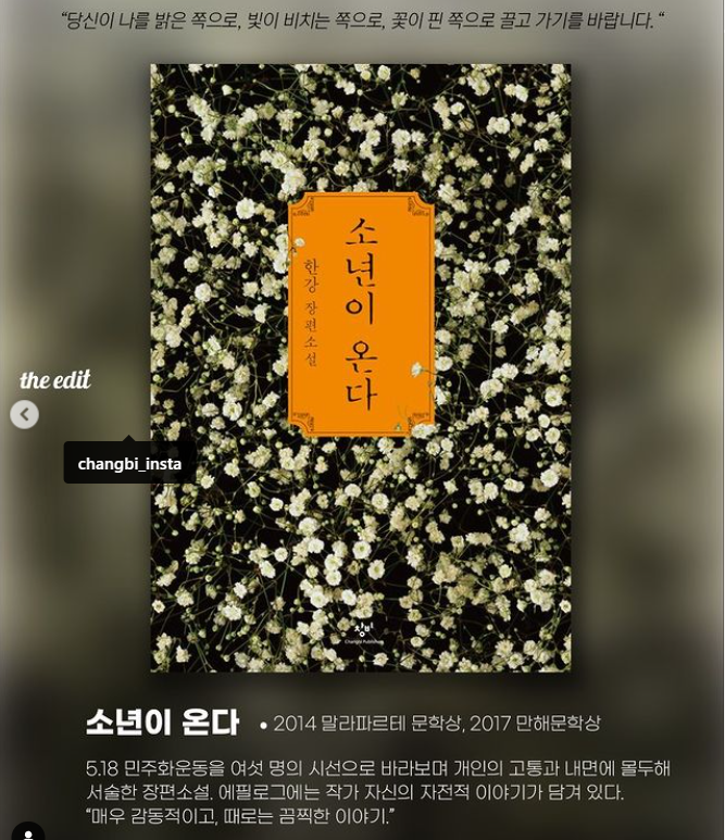 한강 작가님 노벨문학상 수상 축하해요. 아시아 여성 최초이자 한국 최초의 노벨상 수상, DJ 평화상 이어 한국인 2번째 수상의 쾌거라니 흥분 또 흥분하며 국뽕이 차오름을 느낀다. 내 살아 생전에 볼거라도 기대하지 않았던 비주류의 승리라 할 만하다.