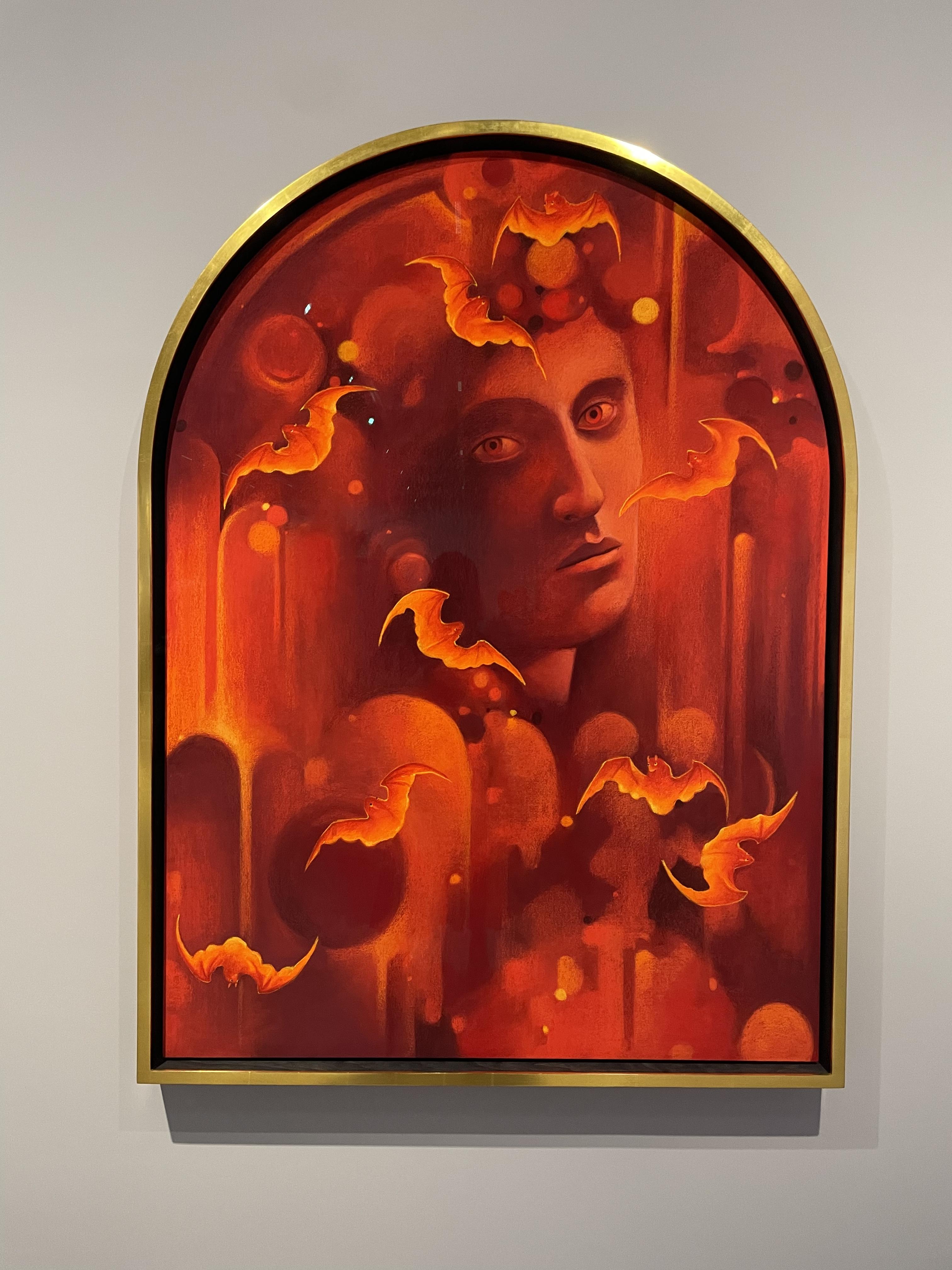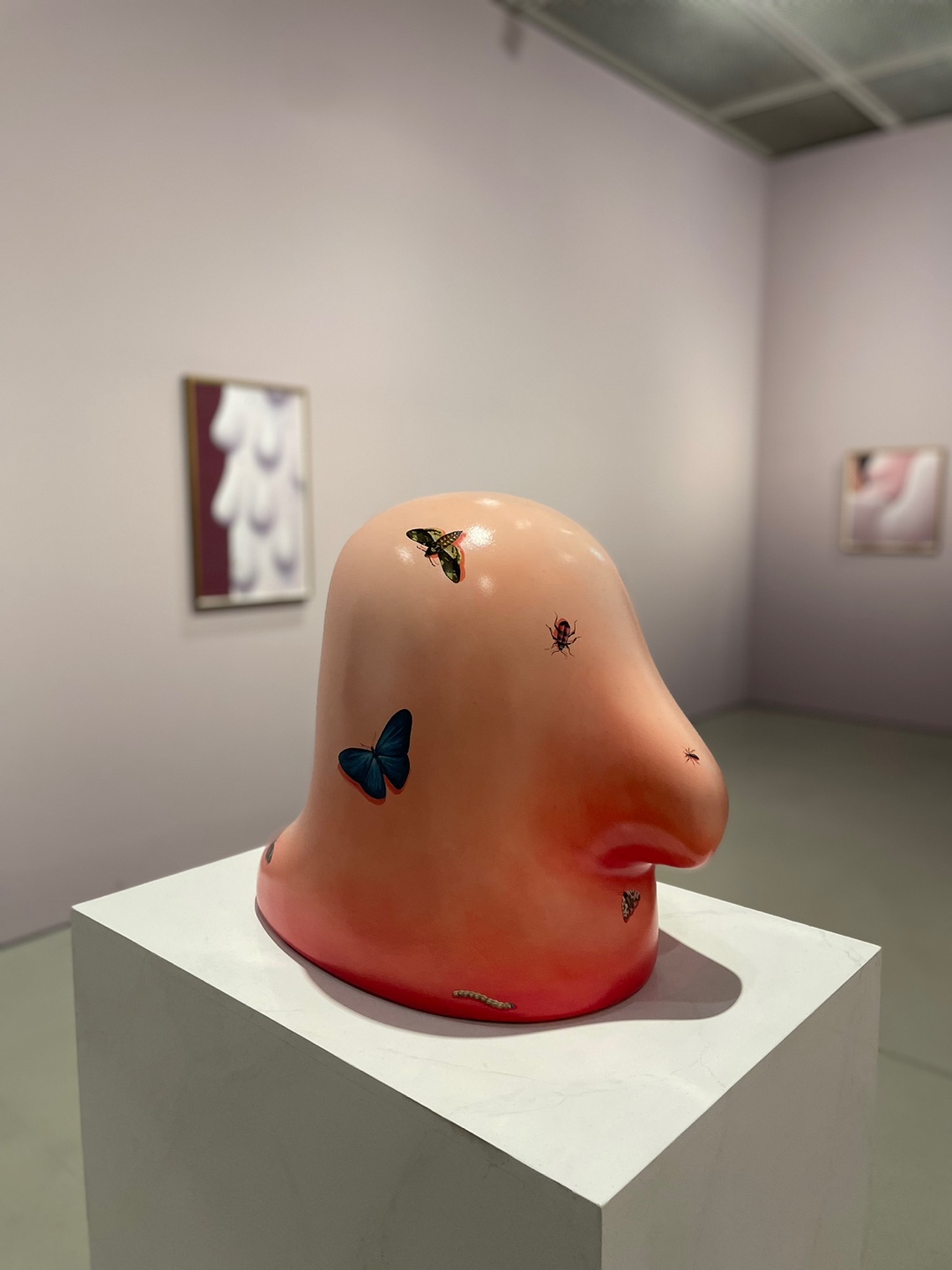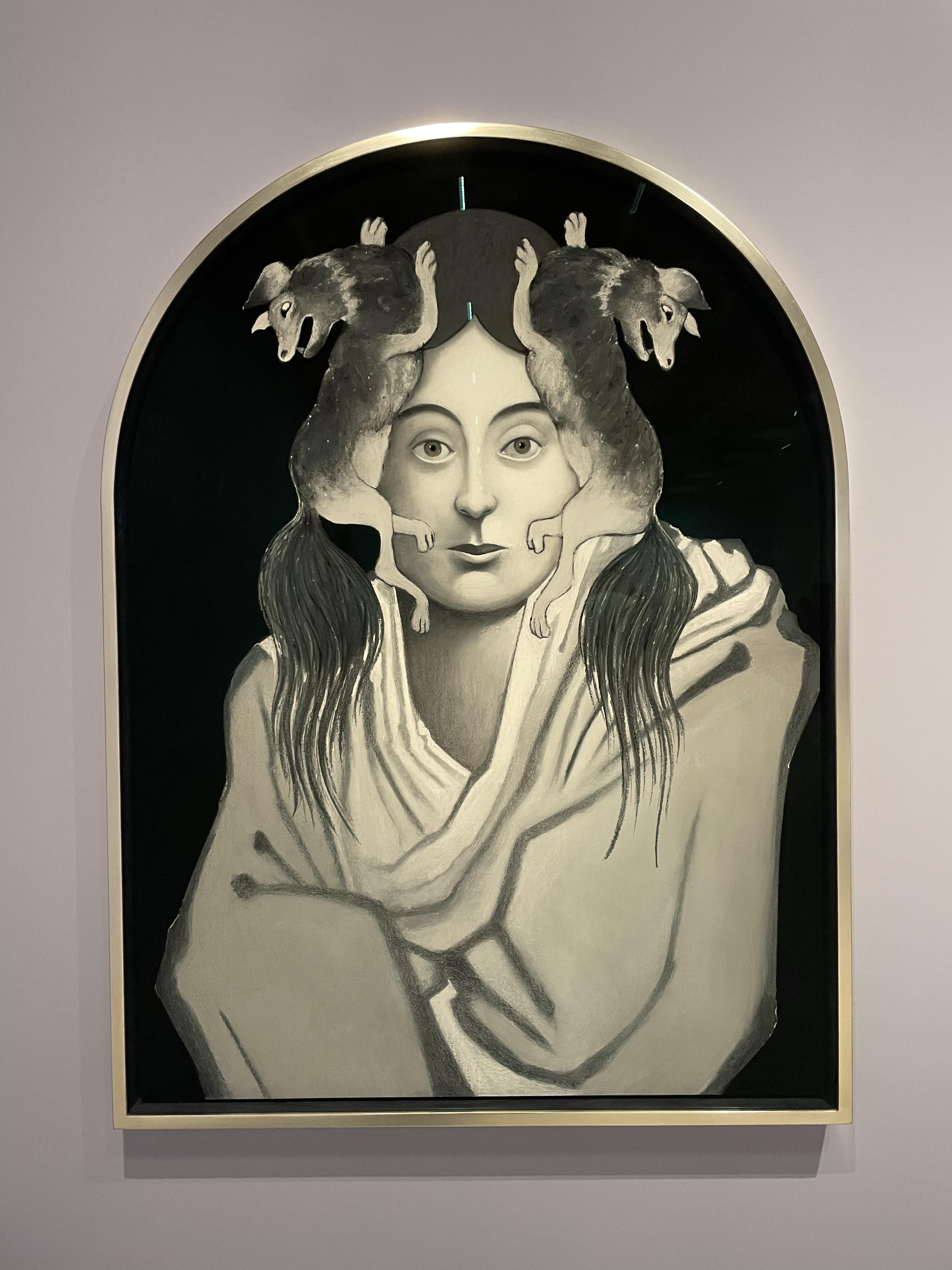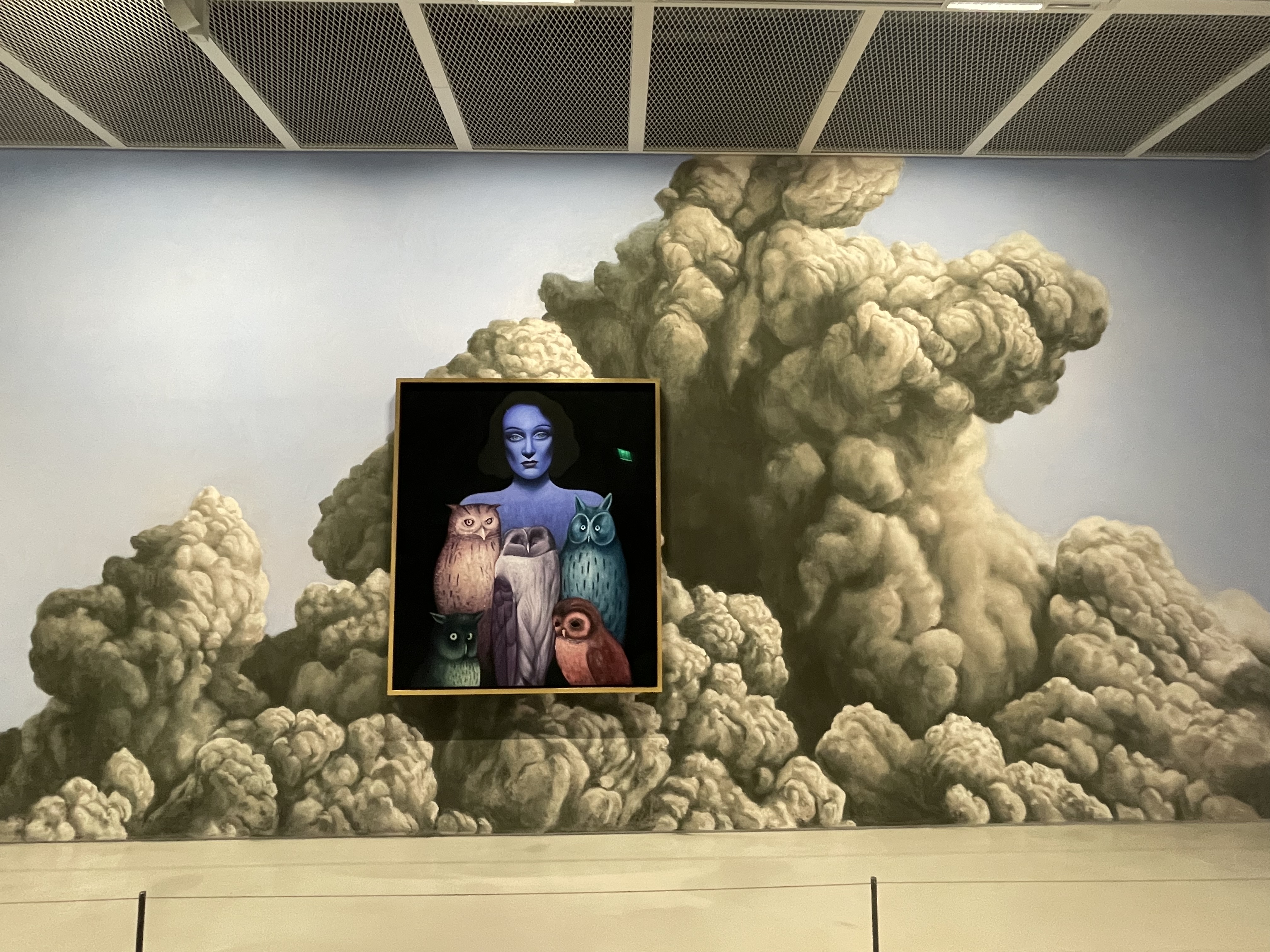 이번에 선보인 신작 초상 8점은 동굴과 백자 태호, 꽃, 버섯, 운석과 합체된 인간, 멸종된 공룡과 상상의 동물 용, 붉은 숲과 잿빛 구름 풍경 등 동서고금의 문화적 상징과 재현을 뒤섞고, 낭만주의적 숭고와 재난의 이미지를 교차시키는 기지를 발휘한다.