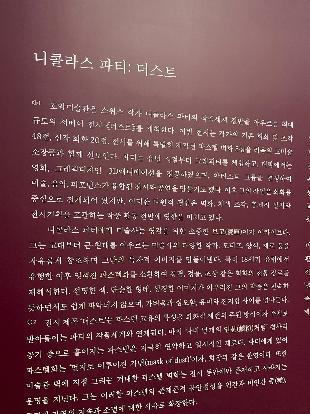 스위스 작가 니콜라스 파티의 최대 규모의 서베이 전시 《더스트》가 열리는 호암 미술관에 다녀왔다. 기존 회화 및 조각 48점, 신작 회화 20점, 특히 이번 전시를 위해 특별 제작된 파스텔 벽화 5점을 리움의 고미술 소장품인 김홍도의 군선도와 18세기 십장생도와 함께 선보이는 독특한 방식이다.