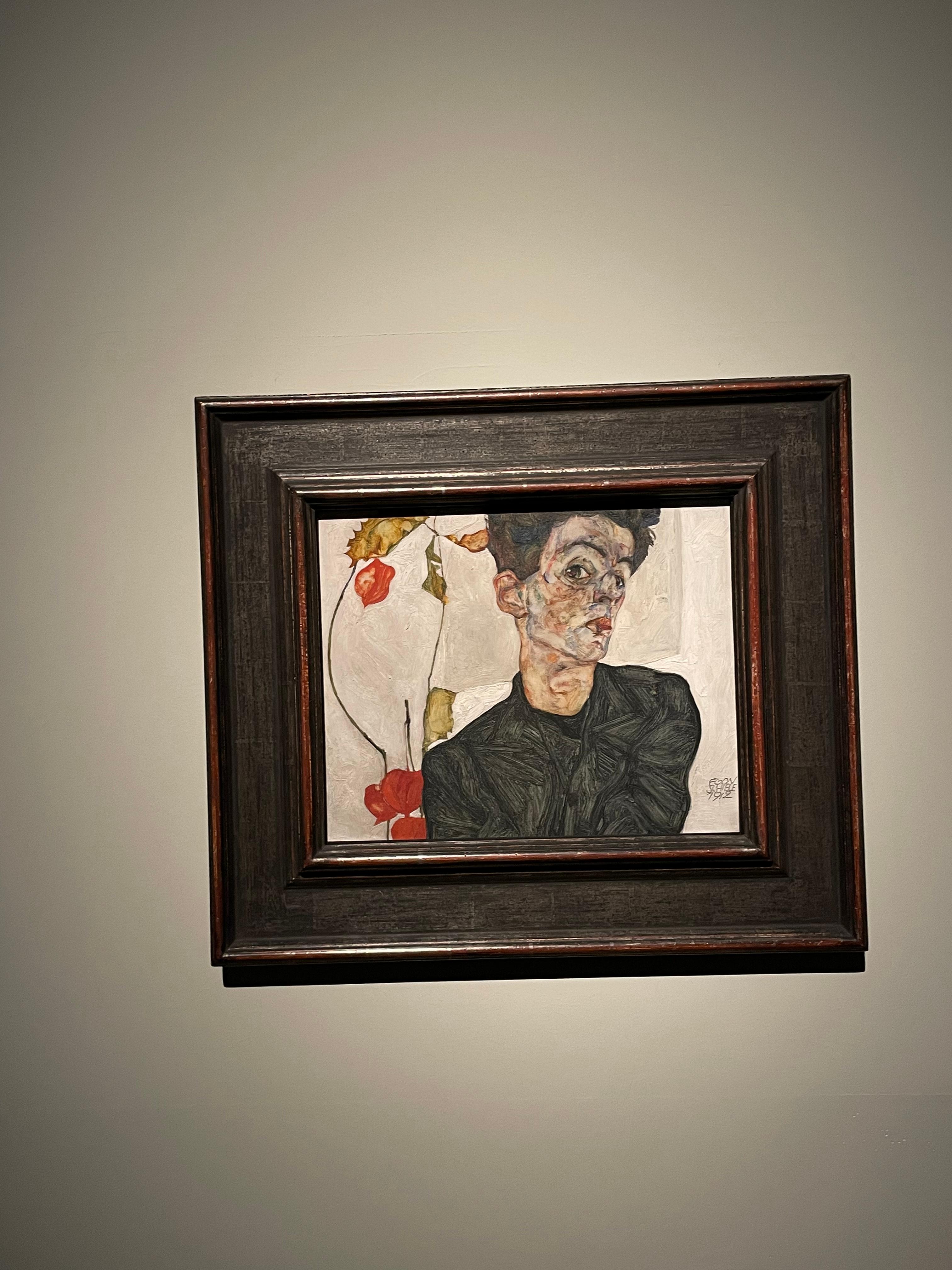 에곤 쉴레의 작품 46점 중 꽈리 열매가 있는 자화상(1912년)은 작가의 높은 자신감과 창의적이고 디테일한 표현 기법이 가장 인상적이다.