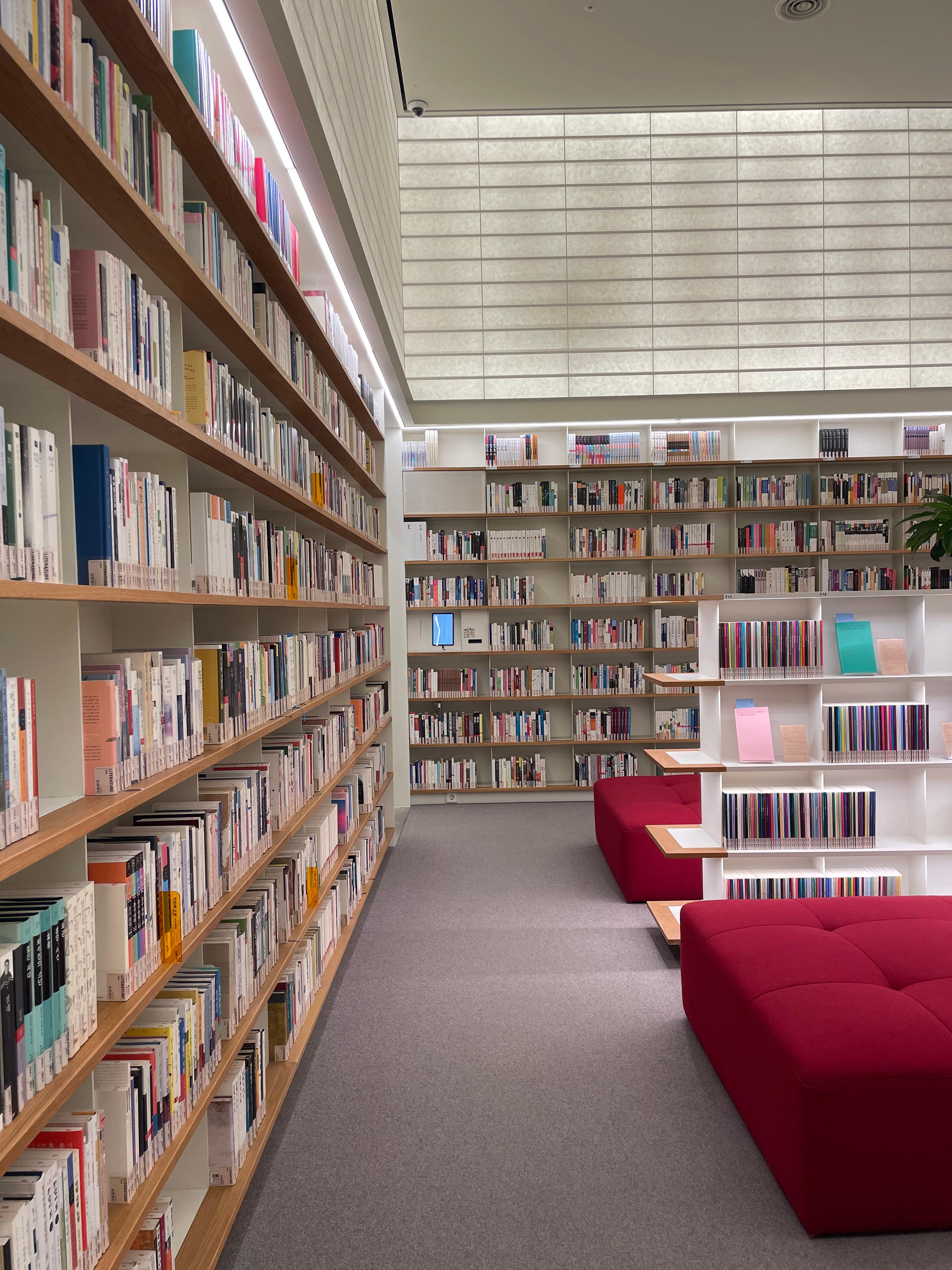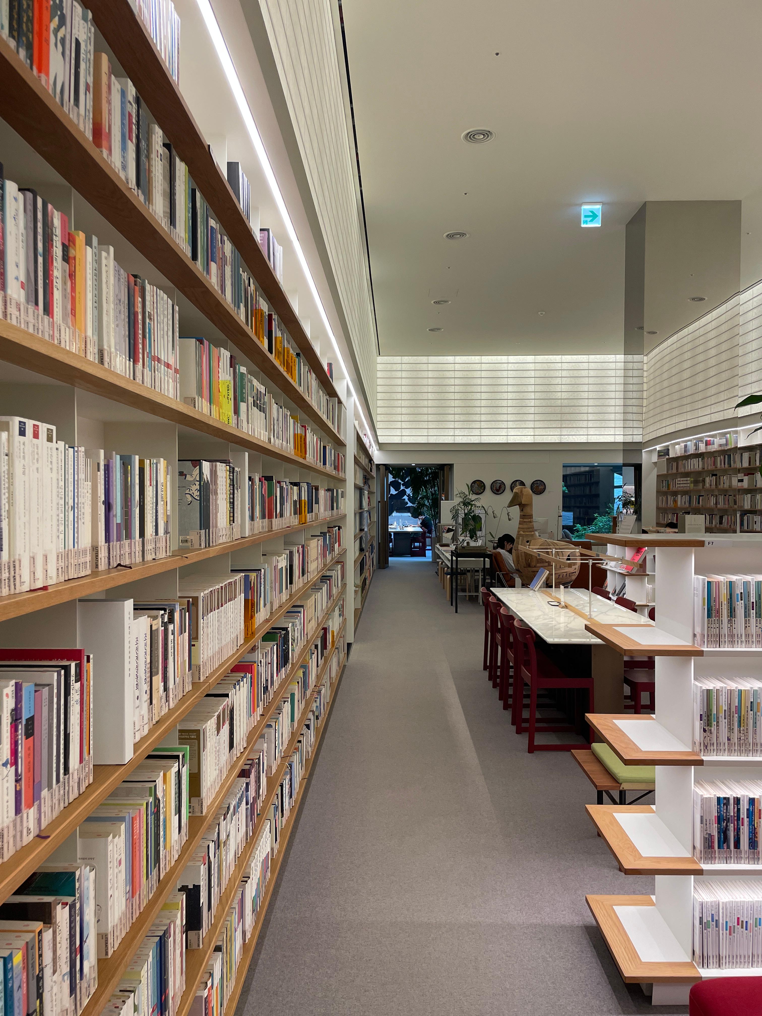 낮은 조도의 독서하기 좋은 조명과 벽면 서가와 서가 내부의 간접조명이 아주 훌륭했다.