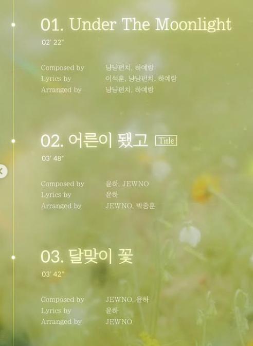 이번 앨범은 윤하가 작사, 작곡한 블루스 기반의 센티멘털 발라드 ’달맞이 꽃‘, 사랑하는 이를 위한 자장가 같은 ’Under The Moonlight(언더 더 문라이트)‘, 사랑을 일상의 언어로 진솔하게 표현한 ’이러면 사랑이지‘, 잔잔하고 미니멀한 Lofi(로파이) 무드의 ’Whisper(위스퍼)‘까지 총 5곡이다.
