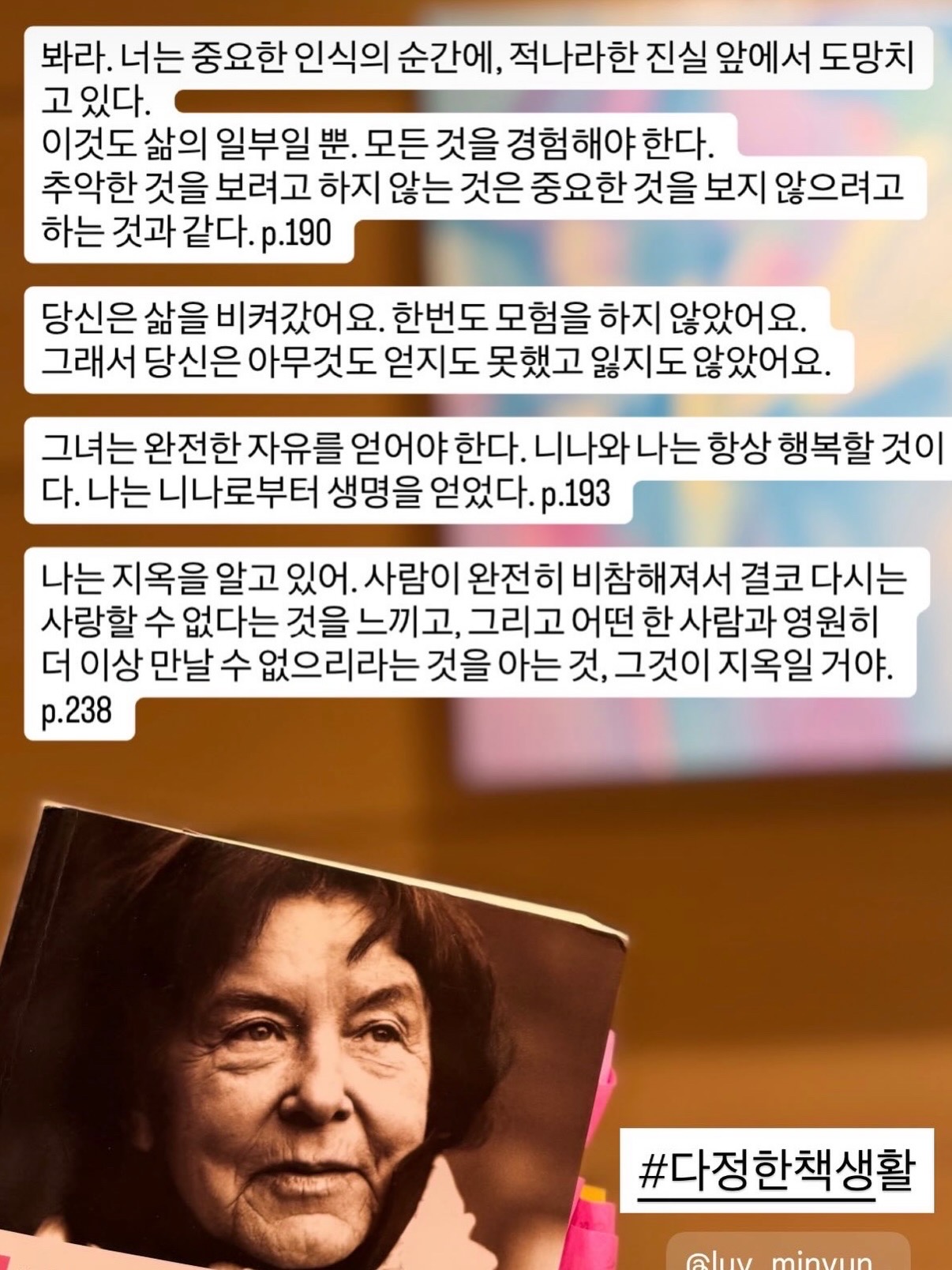 늘 모험과 안정 사이에서 방황하는 나에게 기꺼이 고통을 껴앉는 니나의 용기있는 삶이 큰 울림을 주었다.
