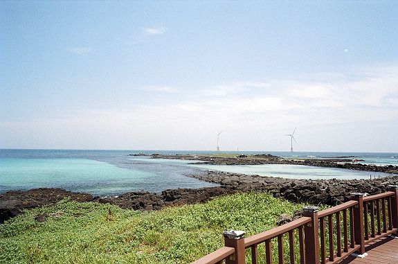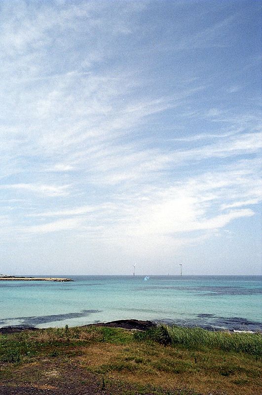 월정리에 도착하니 해변의 모래는 눈이 부실 정도로 희고 고와 햇빛을 가득 받을 때의 경관이 은빛 일색이다. 바다 빛깔은 육지와의 거리에 따라 물빛이 연한기도 하고 진한 푸른빛을 띠기도 하고 깊은 푸른빛이 나기도 한다. 에머랄드 빛으로 빛나는 바다는 새파란 하늘과 함께 마치 그리스의 산토리니에 온 듯한 이국적인 풍경을 보여준다.