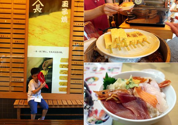 역시 시장 구경의 핵심은 길거리 음식. 계란 말이를 예술로 해내는 가게에선 어묵바처럼 꼬치에 끼워서 소스를 얹어 파는 100엔짜리 계란말이 바를 사먹었는데 그 맛이 환상적이었다. 맛도 약간 단맛과 그냥 단맛, 그리고 차가운 것, 따뜻한 것으로 선택이 가능하다.
