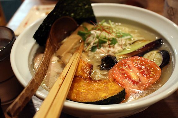 닭고기 육수에 쫄깃한 면발, 그 위에 가지, 단호박, 토마토, 김, 닭고기로 토핑을 얹은 쯔케소바