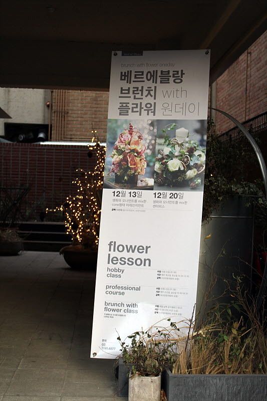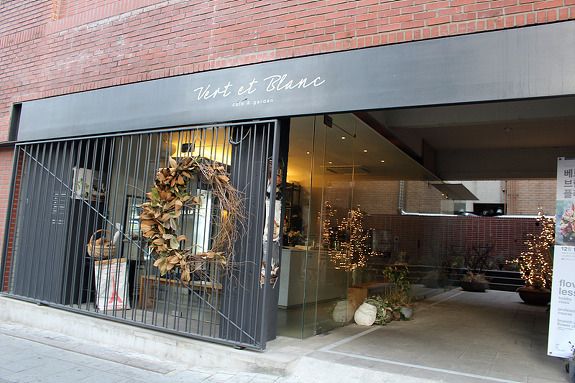 베르 에 블랑(Vert et Blanc)은 상수역 2번 출구에서 극동방송국 방향으로 100미터 정도만 걸어가다보면 오른쪽에 보이는 적벽돌 건물이다. 1층에는 대형 생화로 만든 리스가 있는 꽃집 같은 데 가까이 가보면 카페와 플라워샵을 함께 겸하는 복합 공간임을 알 수 있다.