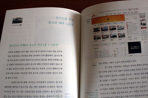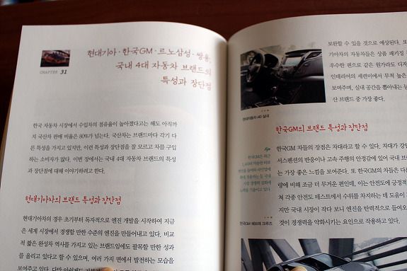 이 책의 미덕은 나같은 여성들에게도 쉽게 읽힌다는 것이다. 솔직히 나는 가솔린과 디젤 자동차 엔진이 어떤 차이가 있는지, 자동 변속기와 수동변속기의 차이도 잘 모른다. 그래도 괜찮다. 이 책의 두 저자는 다년간 블로거로 활동해서 그런지 알기 쉽게 찬찬히 설명해 준다. 책 한권을 가진 것 뿐인데 마치 차에 대해서 잘 아는 남자친구를 옆에 둔것처럼 든든한 기분이 든다. 궁금하면 언제라도 착! 하고 펴들수 있으니 말이다.