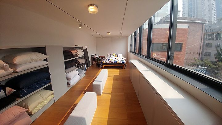 2층 계단을 따라 올라가면 커튼과 쿠션 코너가 있다 키티버니포니를 상징하는 수많은 패턴들이 솜과 함께 수북하게 쌓여 있어 직접 끼워보고 구매 전 제품을 경험할 수 있다. 쿠션 패턴과 연결되는 다양한 패브릭 액자들도 함께 만날 수 있고 이불과 침대커버 같은 것도 햇살 좋은 통창 한켠에 전시되어 있다.