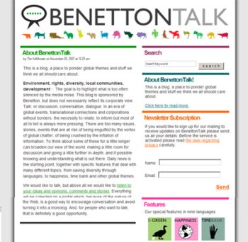 베네통은 이미 광고 등을 통해 파격적인 커뮤니케이션을 잘 하기로 유명하다. 2007년 11월에 오픈한 이 블로그는 기업의 사회적 책임에 대한 사회적 관심을 불러일으키기 위해 환경, 에이즈, 사회 참여, 섹스 등 다양한 사회참여 메시지를 담고 있다.