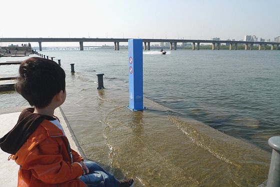 강물 위 모터보트를 신기하게 쳐다보는 중