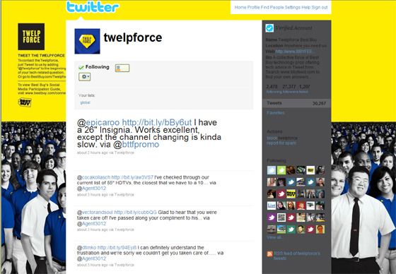 규모가 큰 만큼 이들에게 쏟아지는 고객 문의나 클레임도 무지무지 많을 것이다. 그런데 이 베스트바이가 소셜미디어를 활용해 고객 대응에 발벗고 나서 성공적인 사례를 만들어냈다. 베스트 바이의 트웰프포스(@TWELPFORCE)는 불만 메시지 뜨면 직원 2600명이 참여해 12분내 조치한다는 트위터로 고객 감동도 이루고 직원들간의 자발적 열정을 이끌어내는 멋진 사례로 꼽힌다. 2010년 Clio Awards에서 가장 혁신적인 기술에 주여지는 'Interactive Gold'를 비롯해 2009년 미국의 각종 디지털 어워드를 석권했다.(2010 D&AD In Book, 2010 ADC Interactive Merit, 2009 Creativity Top 10 Digital Ideas, and 2009 Contagious Magazine’s Most Contagious)
