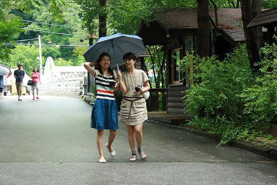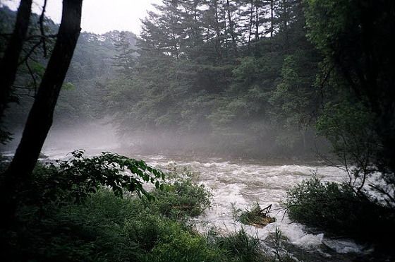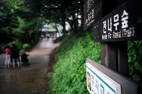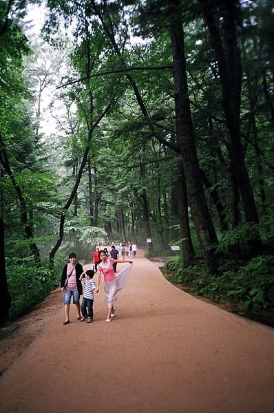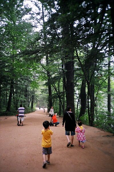 펜션 주인이 가보라고 추천한 두 곳은 오대산국립공원의 월정사와 야생 식물원이었는데, 그 중에서 몇년 전에 한번 가 본적 있는 월정사의 길고 멋진 전나무숲을 다시 찾았다. 오대산의 대표적인 사찰인 월정사는 수많은 문화재가 있는 유명 사찰이기도 하지만, 부안 내소사, 남양주 광릉수목원과 함께 한국 3대 전나무숲길이 더욱 유명하다. 월정사 일주문에서 대웅전까지 1km에 달하는 이 길에는 여름에도 햇빛이 자연적으로 차단될 정도로 500년 수령의 전나무 1700여 그루가 빼곡히 들어차 있다. 이 길을 따라 걷다보면 자연의 기운이 내 몸을 통과해 맑고 깨끗해지는 느낌이 든다. 전나무 숲 옆으로 흐르는 물은 비로 인해 세차게 흐르면서 더욱 멋진 풍경을 제공하는 곳.